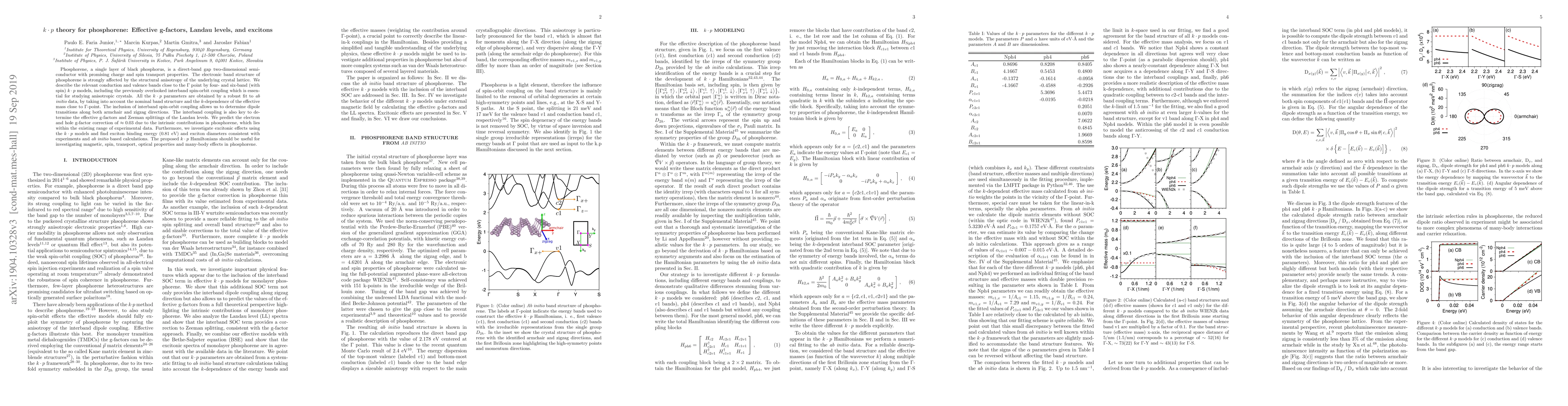 Phosphorene, a single layer of black phosphorus, is a direct-band gap two-dimensional semiconductor with promising charge and spin transport properties. The electronic band structure of phosphorene is strongly affected by the structural anisotropy of the underlying crystal lattice. We describe the relevant conduction and valence bands close to the $\Gamma$ point by four- and six-band (with spin) $k \cdot p$ models, including the previously overlooked interband spin-orbit coupling which is essential for studying anisotropic crystals. All the $k \cdot p$ parameters are obtained by a robust fit to {\it ab initio} data, by taking into account the nominal band structure and the $k$-dependence of the effective mass close to $\Gamma$-point. The inclusion of interband spin-orbit coupling allows us to determine dipole transitions along both armchair and zigzag directions. The interband coupling is also key to determine the effective g-factors and Zeeman splittings of the Landau levels. We predict the electron and hole g-factor correction of $\approx 0.03$ due to the intrinsic contributions in phosphorene, which lies within the existing range of experimental data. Furthermore, we investigate excitonic effects using the $k \cdot p$ models and find exciton binding energy (0.81 eV) and exciton diameters consistent with experiments and {\it ab initio} based calculations. The proposed $k \cdot p$ Hamiltonians should be useful for investigating magnetic, spin, transport, optical properties and many-body effects in phosphorene.