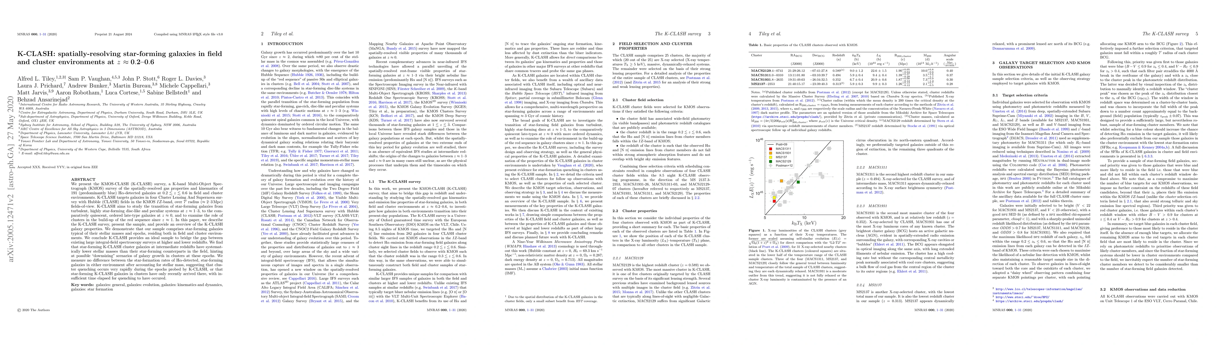 The K-CLASH survey uses KMOS to study the gas properties and kinematics of 191 H$\alpha$-detected galaxies at $z \approx 0.2$-$0.6$ in both field and cluster environments, aiming to bridge the gap between high- and low-redshift star-forming galaxies. The survey finds that cluster galaxies have lower stellar masses than field counterparts, indicating possible "downsizing" in cluster growth, while star-formation rates are similar across environments, suggesting rapid quenching in clusters.