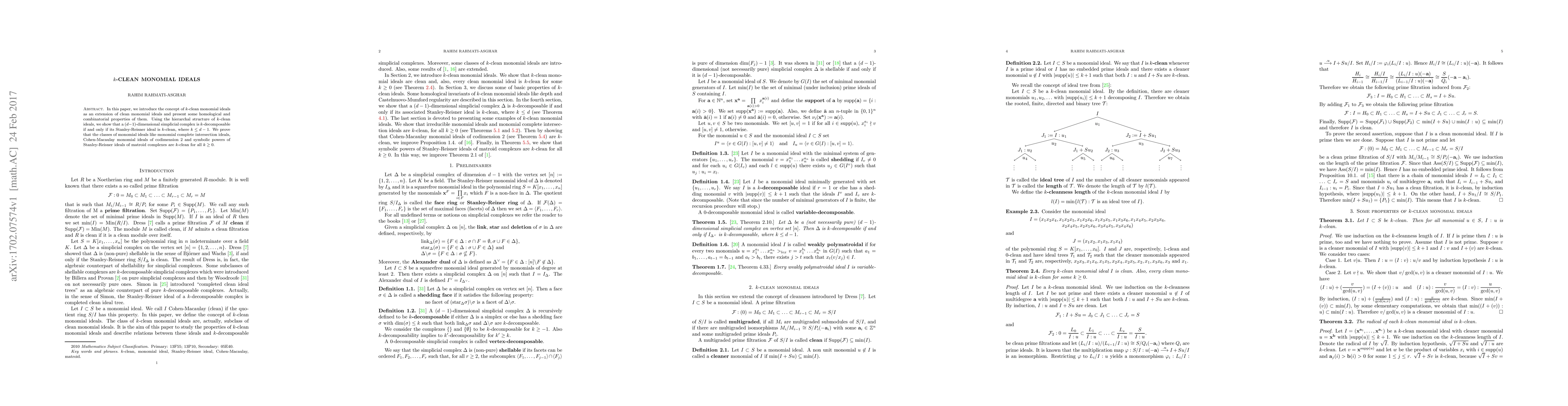 This paper introduces $k$-clean monomial ideals, extending the notion of clean ideals, and explores their homological and combinatorial properties. It demonstrates that a $(d-1)$-dimensional simplicial complex is $k$-decomposable if its Stanley-Reisner ideal is $k$-clean, for $k\leq d-1$, and confirms that specific classes of monomial ideals are $k$-clean for all $k\geq 0$.