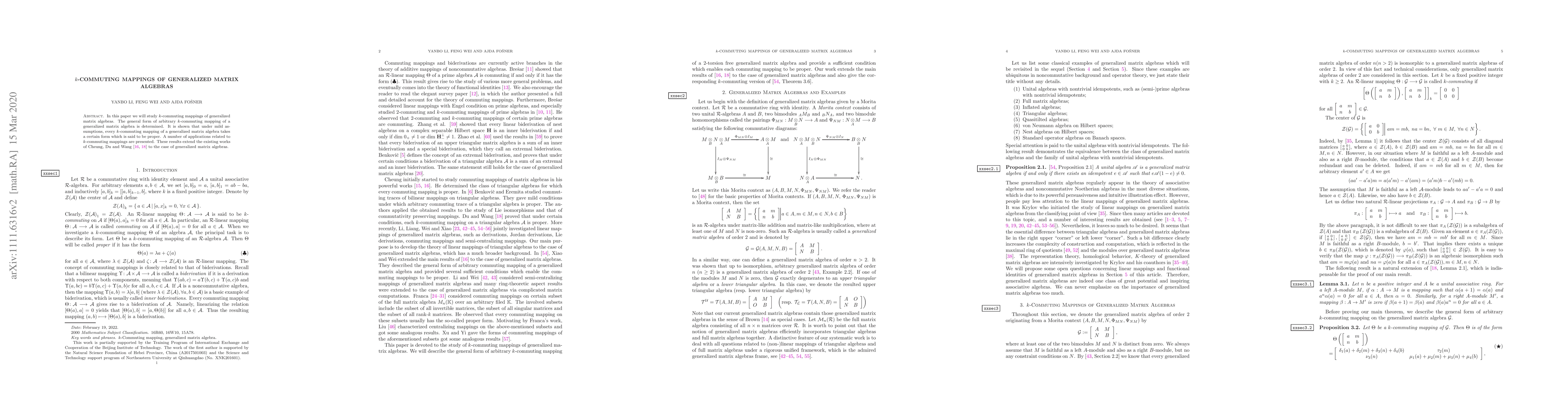This paper determines the general form of $k$-commuting mappings in generalized matrix algebras, proving that under mild assumptions, these mappings take a specific "proper" form. The findings extend previous work by Cheung, Du, and Wang to this broader context.