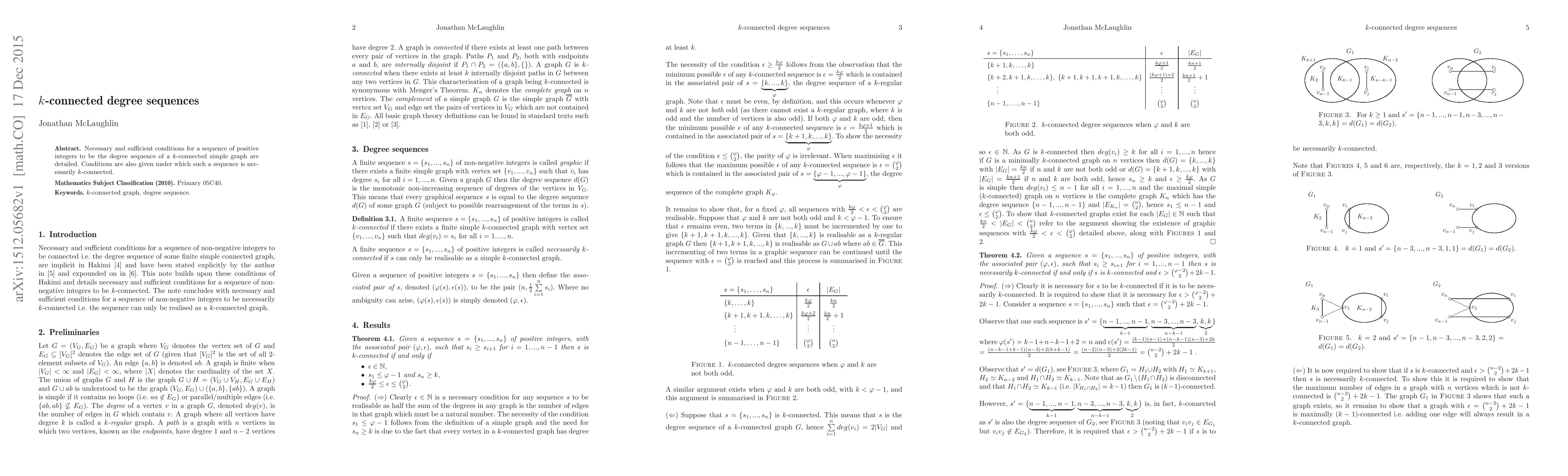Summary: This paper provides necessary and sufficient conditions for a sequence of positive integers to represent the degree sequence of a k-connected simple graph, along with criteria ensuring that such a sequence guarantees k-connectivity.
