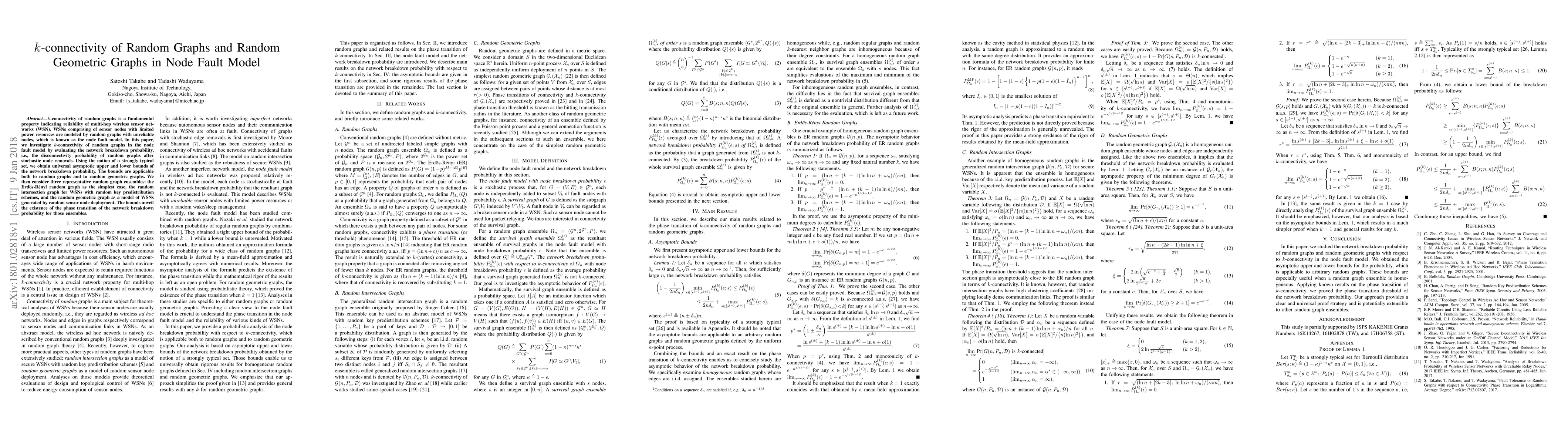 This paper investigates k-connectivity in random graphs under the node fault model, focusing on the disconnectivity probability after stochastic node removals. It establishes universal asymptotic bounds for the network breakdown probability applicable to both random graphs and random geometric graphs, revealing a phase transition in connectivity for various graph ensembles.