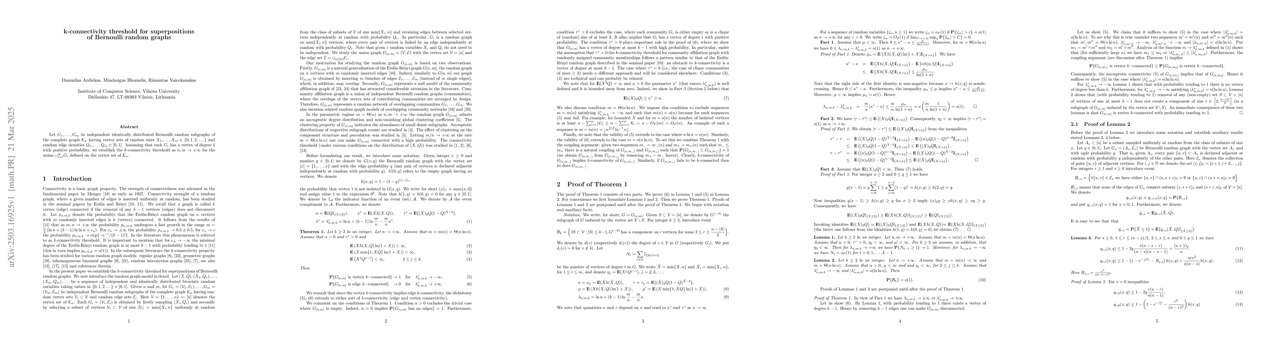 The paper establishes the k-connectivity threshold for superpositions of Bernoulli random graphs by analyzing independent identically distributed Bernoulli random subgraphs of the complete graph Kn with random sizes Xi and edge densities Qi.