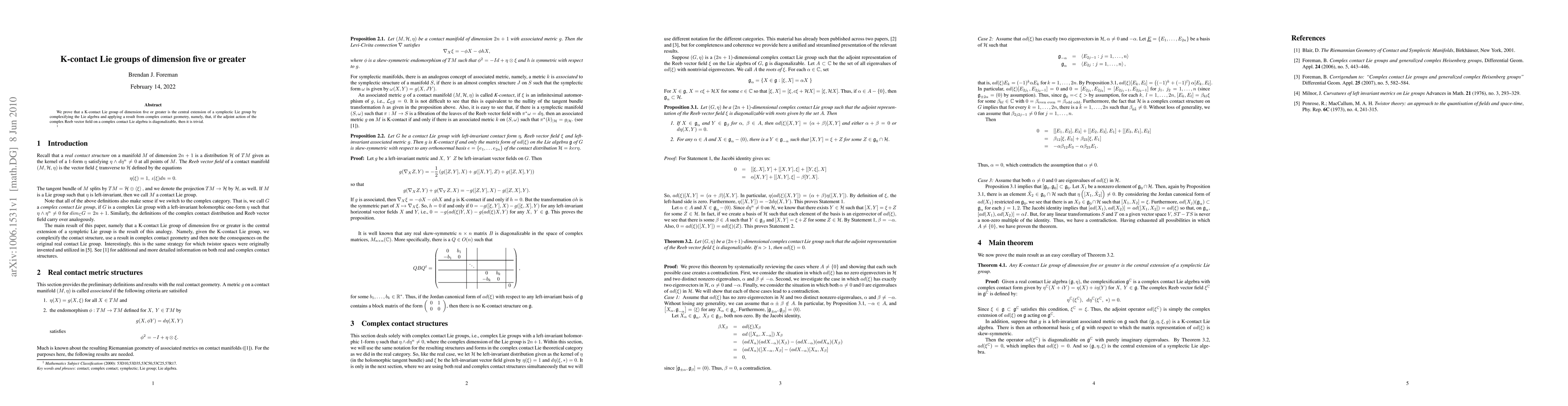 We prove that a K-contact Lie group of dimension five or greater is the central extension of a symplectic Lie group by complexifying the Lie algebra and applying a result from complex contact geometry, namely, that, if the adjoint action of the complex Reeb vector field on a complex contact Lie algebra is diagonalizable, then it is trivial.