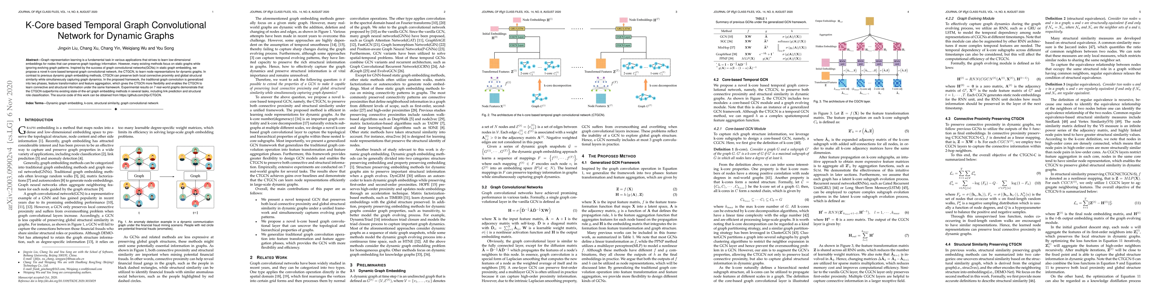 This paper proposes a k-core based temporal graph convolutional network (CTGCN) to learn node representations for dynamic graphs, preserving both local connectivity and global structural similarity while capturing graph evolution. Experimental results show CTGCN outperforms existing methods in link prediction and structural role classification.