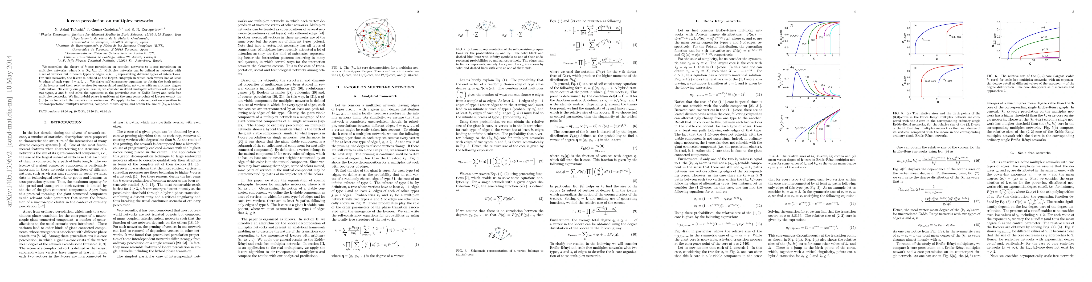 This paper extends k-core percolation theory to multiplex networks, defining k-cores based on minimum edge requirements for each interaction type. The authors derive self-consistency equations to determine k-core emergence and sizes, finding hybrid phase transitions in multiplex networks, and apply the method to air-transportation networks.