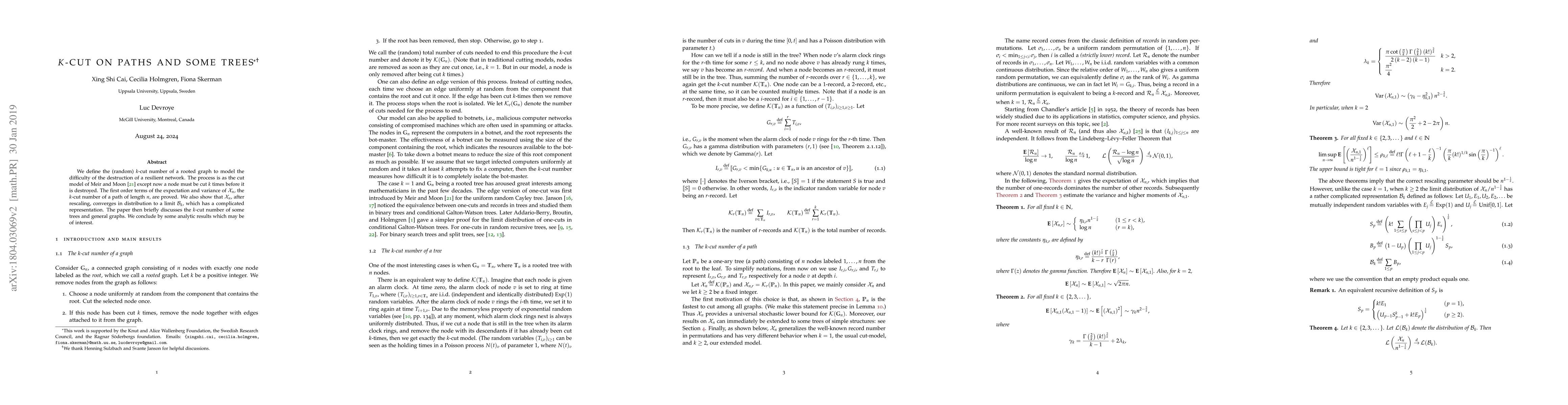 This paper introduces the concept of the $k$-cut number for rooted graphs to model the resilience of networks, where nodes require $k$ cuts to be destroyed. It proves the first order terms of the expectation and variance for the $k$-cut number on paths and shows that, after rescaling, it converges to a limit $\mathcal{B}_{k}$. The paper also briefly discusses the $k$-cut number for some trees and general graphs, concluding with analytic results.