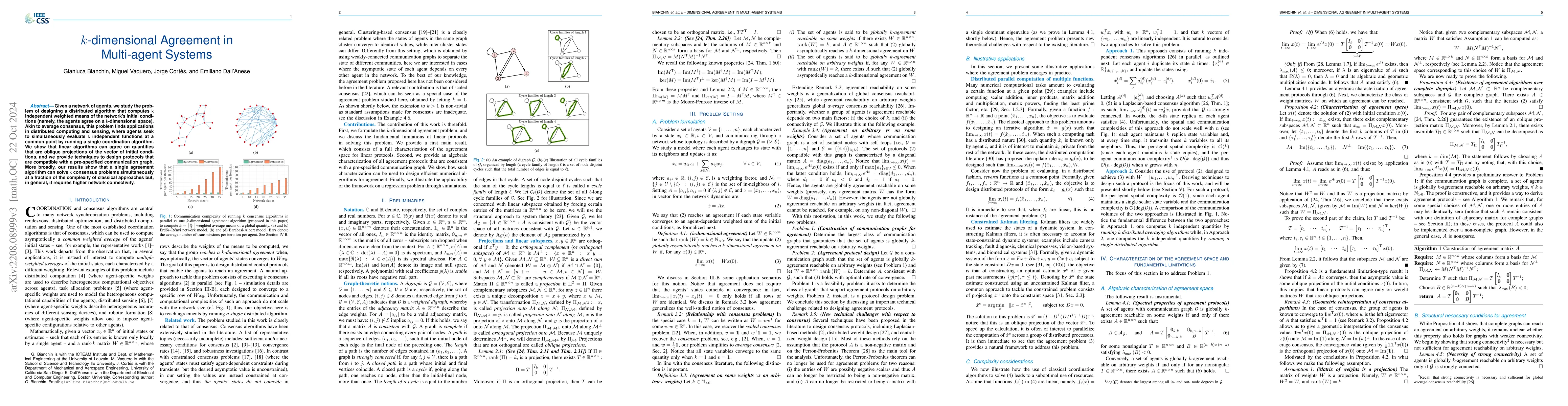 This paper explores distributed linear algorithms for multiagent systems to achieve agreement on a k-dimensional vector, revealing that linear protocols can only agree on oblique projections of initial conditions. The study provides an algebraic framework for designing such protocols and highlights the structural properties of communication networks that enable agreement on arbitrary weights.