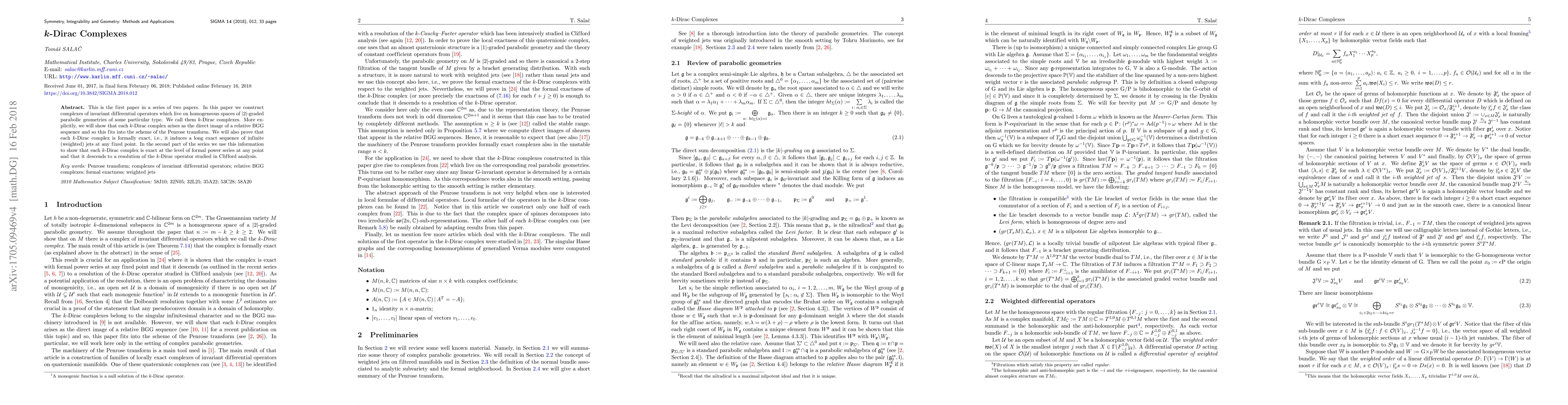 This paper constructs $k$-Dirac complexes, complexes of invariant differential operators on specific homogeneous spaces, showing they arise from relative BGG sequences and are formally exact. The second part of the series will demonstrate their exactness at the level of formal power series and their role in resolving the $k$-Dirac operator in Clifford analysis.