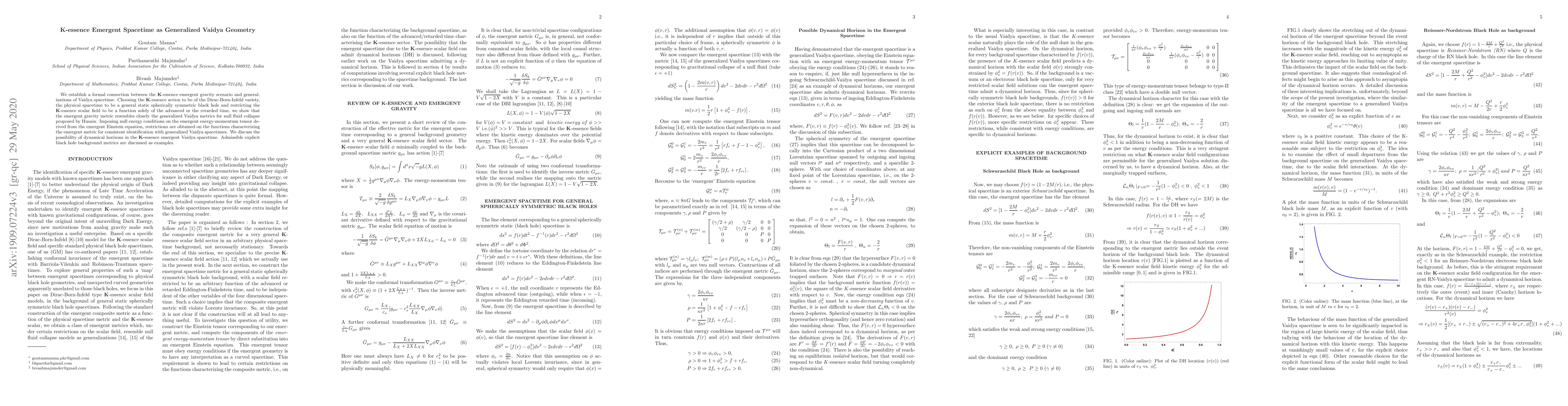 This paper connects K-essence emergent gravity to generalized Vaidya spacetimes, showing that the K-essence metric resembles Vaidya metrics for null fluid collapse under certain conditions, and discusses the implications for dynamical horizons and specific black hole metrics.