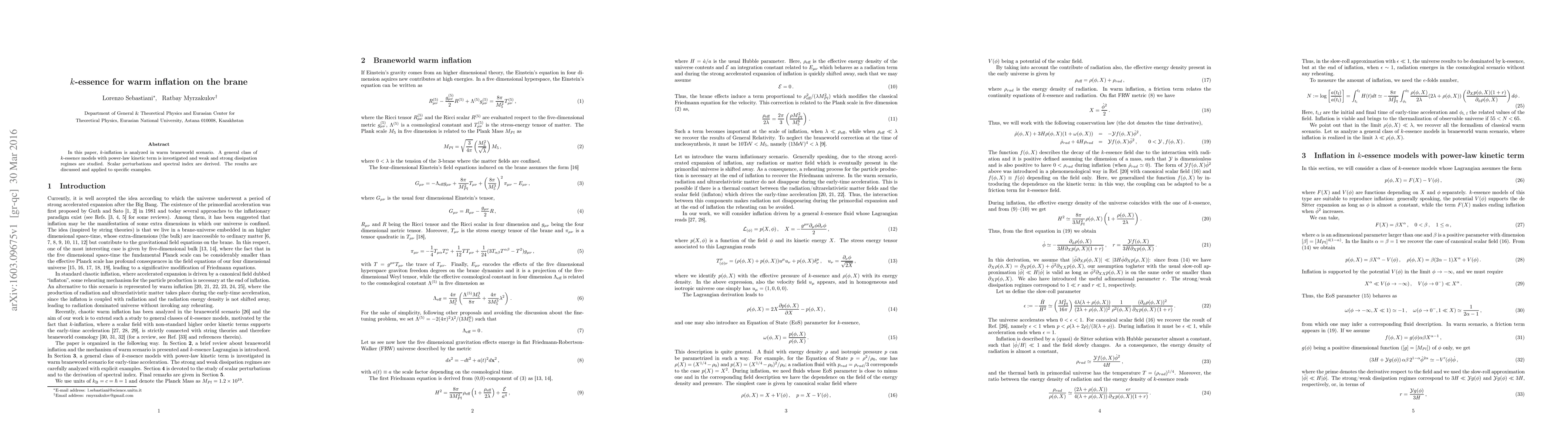 In this paper, $k$-inflation is analyzed in warm braneworld scenario. A general class of $k$-essence models with power-law kinetic term is investigated and weak and strong dissipation regimes are studied. Scalar perturbations and spectral index are derived. The results are discussed and applied to specific examples.