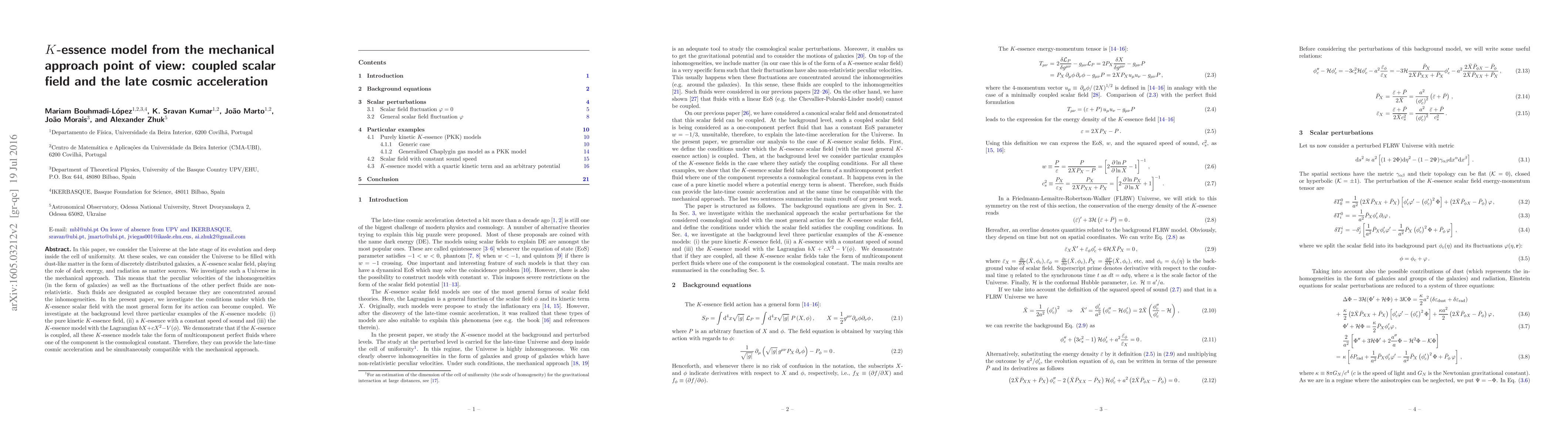 In this paper, we consider the Universe at the late stage of its evolution and deep inside the cell of uniformity. At these scales, we can consider the Universe to be filled with dust-like matter in the form of discretely distributed galaxies, a $K$-essence scalar field, playing the role of dark energy, and radiation as matter sources. We investigate such a Universe in the mechanical approach. This means that the peculiar velocities of the inhomogeneities (in the form of galaxies) as well as the fluctuations of the other perfect fluids are non-relativistic. Such fluids are designated as coupled because they are concentrated around the inhomogeneities. In the present paper, we investigate the conditions under which the $K$-essence scalar field with the most general form for its action can become coupled. We investigate at the background level three particular examples of the $K$-essence models: (i) the pure kinetic $K$-essence field, (ii) a $K$-essence with a constant speed of sound and (iii) the $K$-essence model with the Lagrangian $bX+cX^2-V(\phi)$. We demonstrate that if the $K$-essence is coupled, all these $K$-essence models take the form of multicomponent perfect fluids where one of the component is the cosmological constant. Therefore, they can provide the late-time cosmic acceleration and be simultaneously compatible with the mechanical approach.