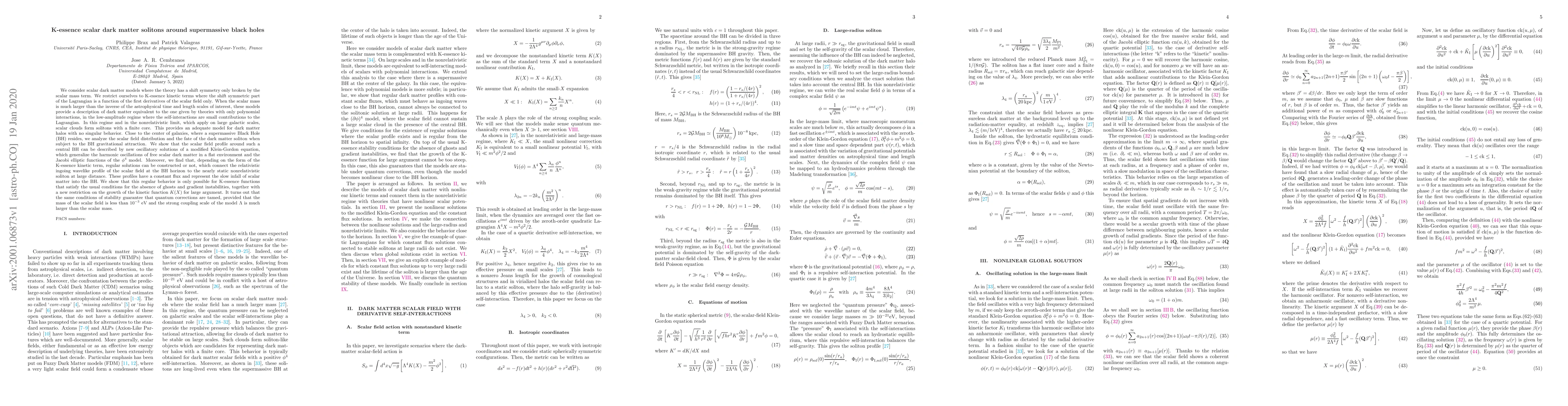 We consider scalar dark matter models where the theory has a shift symmetry only broken by the scalar mass term. We restrict ourselves to K-essence kinetic terms where the shift symmetric part of the Lagrangian is a function of the first derivatives of the scalar field only. In the low-amplitude and nonrelativistic regime, which applies on large galactic scales, scalar clouds form solitons with a finite core. Close to the center of galaxies, where a supermassive Black Hole (BH) resides, we analyze the scalar field distribution and the fate of the dark matter soliton when subject to the BH gravitational attraction. We show that the scalar field profile around such a central BH can be described by new oscillatory solutions of a modified Klein-Gordon equation, which generalize the harmonic oscillations of free scalar dark matter in a flat environment and the Jacobi elliptic functions of the $\phi^4$ model. Moreover, we find that, depending on the form of the K-essence kinetic term, regular solutions can be constructed or not, which connect the relativistic ingoing wavelike profile of the scalar field at the BH horizon to the nearly static nonrelativistic soliton at large distance. These profiles have a constant flux and represent the slow infall of scalar matter into the BH. We show that this regular behavior is only possible for K-essence functions that satisfy the usual conditions for the absence of ghosts and gradient instabilities, together with a new restriction on the growth of the kinetic function $K(X)$ for large argument. It turns out that the same conditions of stability guarantee that quantum corrections are tamed, provided that the mass of the scalar field is less than $10^{-3}$ eV and the strong coupling scale of the model $\Lambda$ is much larger than the scalar mass.