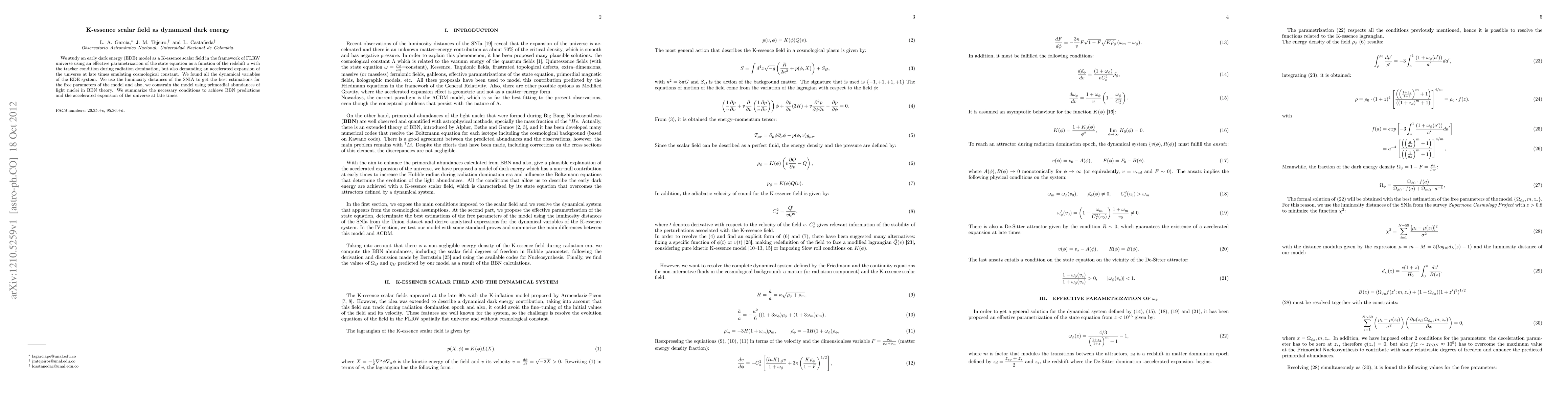 We study an early dark energy (EDE) model as a K-essence scalar field in the framework of FLRW universe using an effective parametrization of the state equation as a function of the redshift $z$ with the tracker condition during radiation domination, but also demanding an accelerated expansion of the universe at late times emulating cosmological constant. We found all the dynamical variables of the EDE system. We use the luminosity distances of the SNIA to get the best estimations for the free parameters of the model and also, we constrain the model using primordial abundances of light nuclei in BBN theory. We summarize the necessary conditions to achieve BBN predictions and the accelerated expansion of the universe at late times.