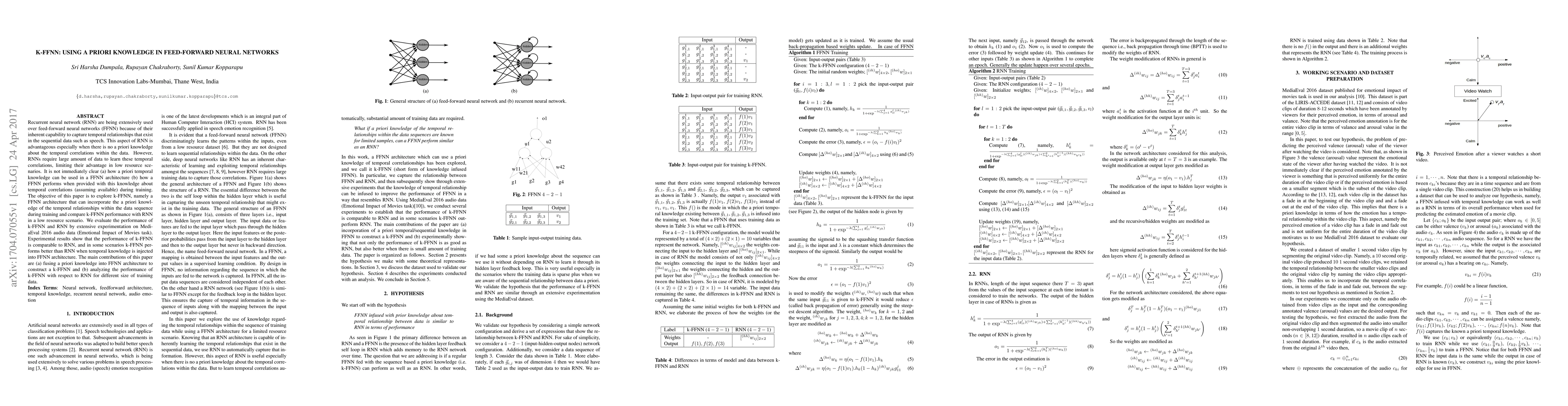 Recurrent neural network (RNN) are being extensively used over feed-forward neural networks (FFNN) because of their inherent capability to capture temporal relationships that exist in the sequential data such as speech. This aspect of RNN is advantageous especially when there is no a priori knowledge about the temporal correlations within the data. However, RNNs require large amount of data to learn these temporal correlations, limiting their advantage in low resource scenarios. It is not immediately clear (a) how a priori temporal knowledge can be used in a FFNN architecture (b) how a FFNN performs when provided with this knowledge about temporal correlations (assuming available) during training. The objective of this paper is to explore k-FFNN, namely a FFNN architecture that can incorporate the a priori knowledge of the temporal relationships within the data sequence during training and compare k-FFNN performance with RNN in a low resource scenario. We evaluate the performance of k-FFNN and RNN by extensive experimentation on MediaEval 2016 audio data ("Emotional Impact of Movies" task). Experimental results show that the performance of k-FFNN is comparable to RNN, and in some scenarios k-FFNN performs better than RNN when temporal knowledge is injected into FFNN architecture. The main contributions of this paper are (a) fusing a priori knowledge into FFNN architecture to construct a k-FFNN and (b) analyzing the performance of k-FFNN with respect to RNN for different size of training data.