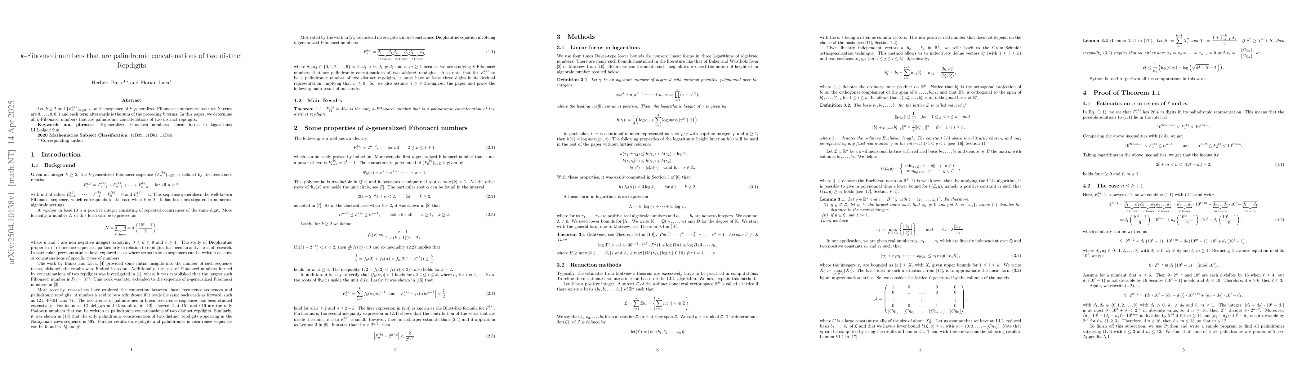 This paper investigates $k$-generalized Fibonacci numbers and identifies those that form palindromic numbers when concatenated as two distinct repdigits. The study focuses on the structural properties of these numbers.