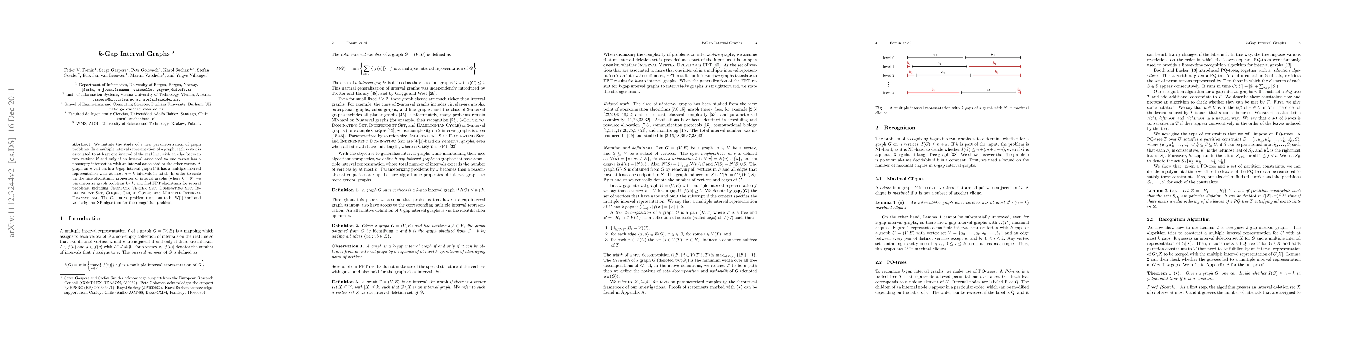 This paper introduces k-gap interval graphs, extending the concept of interval graphs. It presents FPT algorithms for several graph problems parameterized by k, including Feedback Vertex Set, Dominating Set, Independent Set, Clique, Clique Cover, and Multiple Interval Transversal. The Coloring problem is proven W[1]-hard, with an XP algorithm for recognition provided.