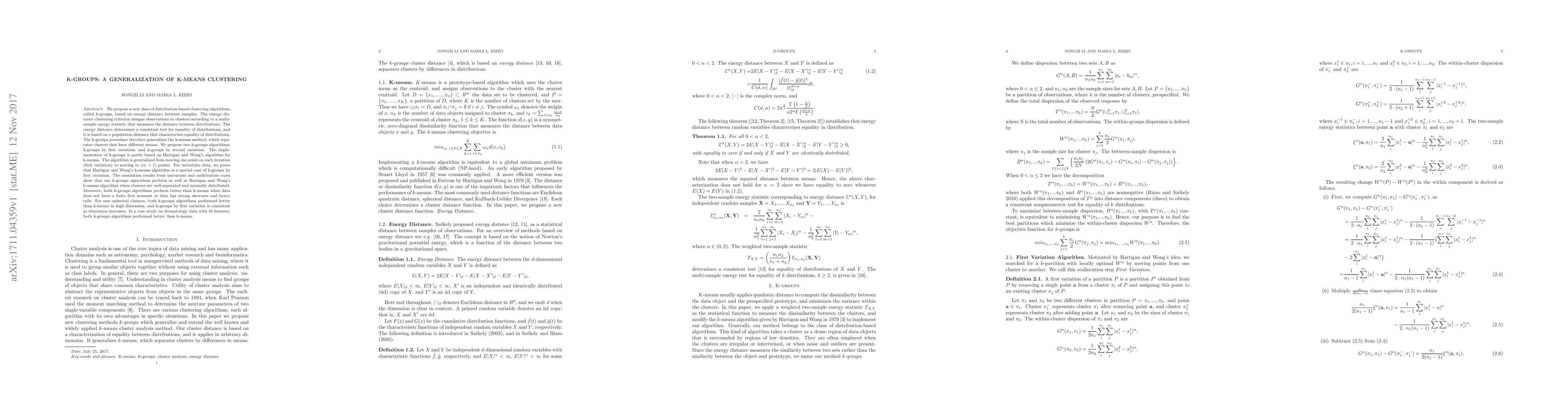 This paper introduces k-groups, a new distribution-based clustering method that generalizes k-means by using energy distance to measure distribution similarity. The proposed k-groups algorithms outperform k-means in scenarios with non-normal distributions and high-dimensional data.
