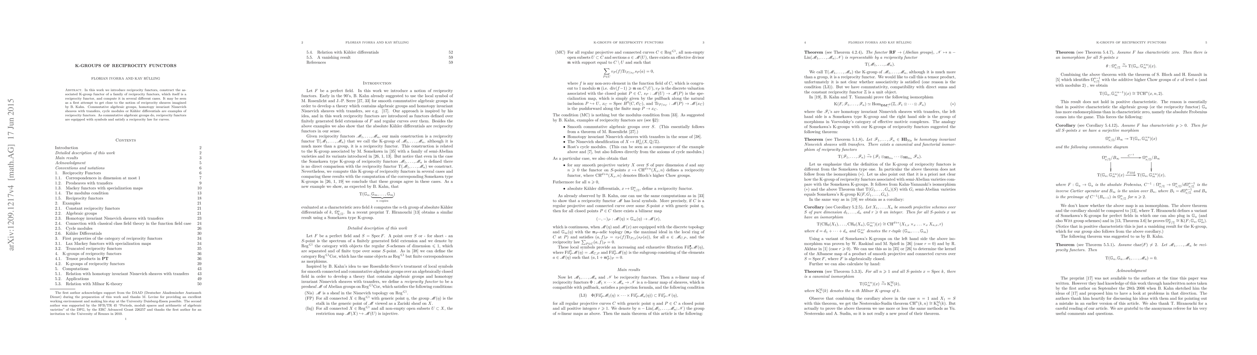 This paper introduces reciprocity functors and constructs their associated K-group, which is itself a reciprocity functor, and computes it in various cases. The work aims to approach the notion of reciprocity sheaves proposed by B. Kahn and includes examples such as commutative algebraic groups and Kähler differentials.