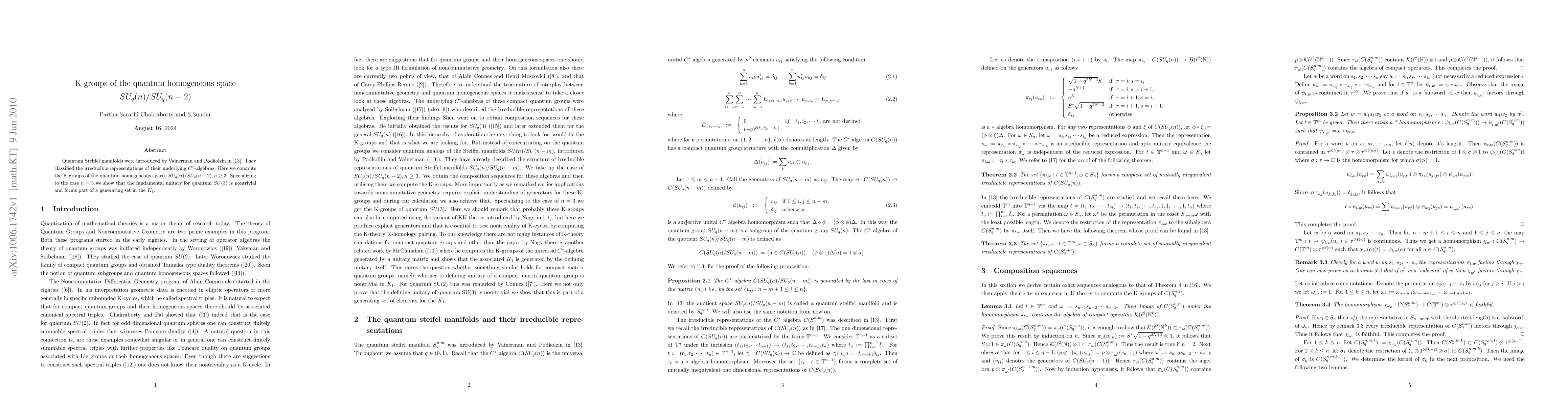 Quantum Steiffel manifolds were introduced by Vainerman and Podkolzin in \cite{VP}. They classified the irreducible representations of their underlying $C^*$-algebras. Here we compute the K groups of the quantum homogeneous spaces $SU_{q}(n)/SU_{q}(n-2), n\ge 3$. Specializing to the case $n=3$ we show that the fundamental unitary for quantum $SU(3)$ is nontrivial and is a unimodular element in $K_1$.