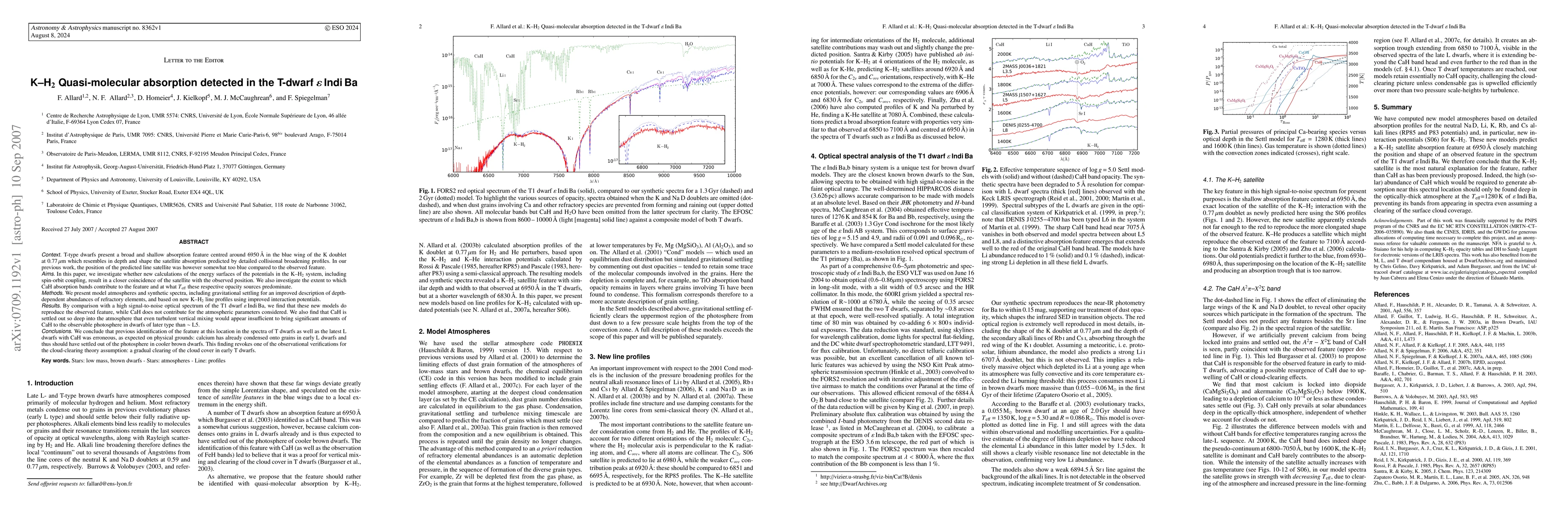 T-type dwarfs present a broad and shallow absorption feature centred around 6950 A in the blue wing of the K doublet at 0.77 micron which resembles in depth and shape the satellite absorption predicted by detailed collisional broadening profiles. In our previous work, the predicted line satellite position was however somewhat too blue compared to the observed feature. In this paper we investigate whether new calculations of the energy surfaces of the potentials in the K-H_2 system, including spin-orbit coupling, result in a closer coincidence of the satellite with the observed position. We also investigate the extent to which CaH absorption bands contribute to the feature. We present model atmospheres and synthetic spectra, including gravitational settling for an improved description of depth-dependent abundances of refractory elements, and based on new K-H_2 line profiles using improved interaction potentials. By comparison with a high signal-to-noise optical spectrum of the T1 dwarf epsilon Indi Ba, we find that these new models do reproduce the observed feature, while CaH does not contribute for the atmospheric parameters considered. We also find that CaH is settled out so deep into the atmosphere that even turbulent vertical mixing would appear insufficient to bring significant amounts of CaH to the photosphere in dwarfs later than ~L5. We conclude that previous identification of the feature at this location in T and late L dwarf spectra with CaH was erroneous, as expected on physical grounds: calcium condenses onto grains in early L dwarfs and thus should have settled out of the photosphere in cooler brown dwarfs. This finding revokes one observational verification for the cloud-clearing theory: a gradual clearing of the cloud cover in early T dwarfs.
