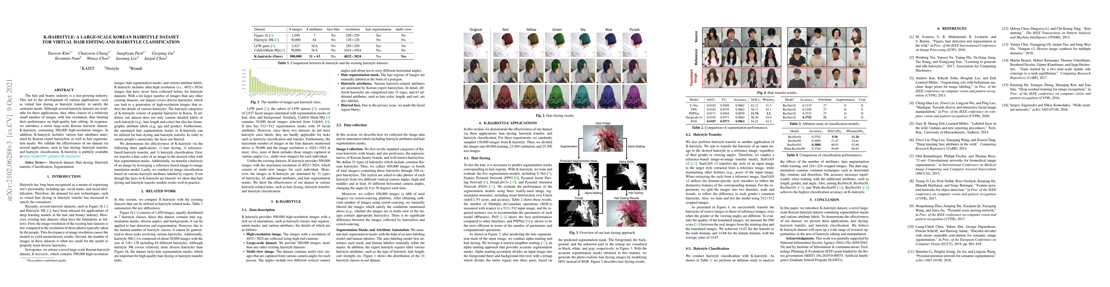The K-Hairstyle dataset presents a large-scale collection of 500,000 high-resolution Korean hairstyle images, annotated with detailed attributes and segmentation masks, aimed at improving virtual hair editing and classification applications. The dataset's effectiveness is demonstrated through applications like hair dyeing, transfer, and classification.