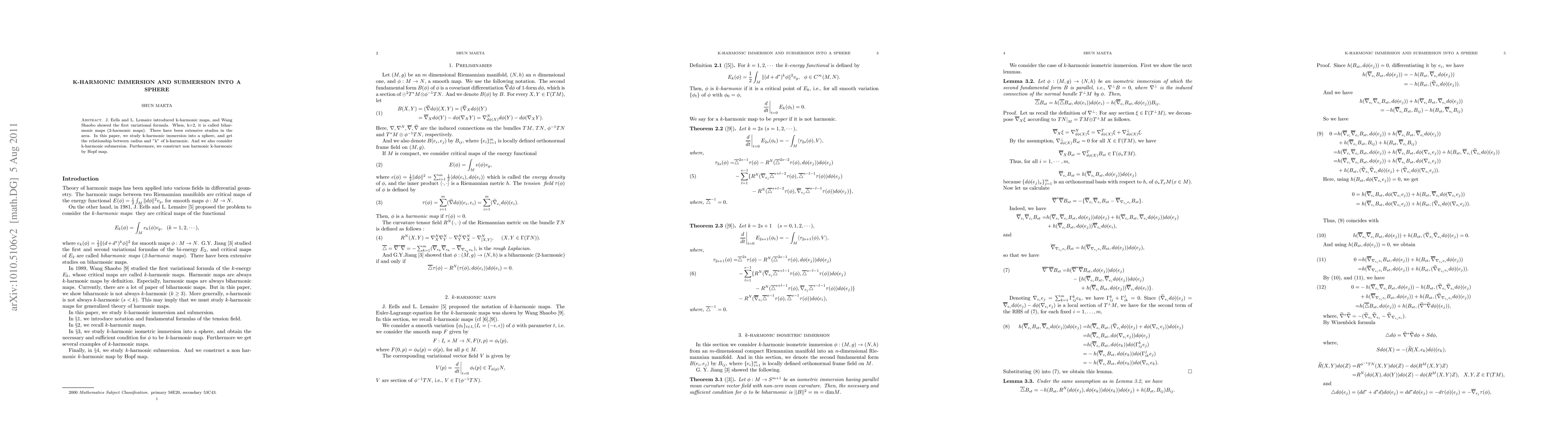 J. Eells and L. Lemaire introduced k-harmonic maps, and Wang Shaobo showed the first variational formula. When, k=2, it is called biharmonic maps (2-harmonic maps). There have been extensive studies in the area. In this paper, We study k-harmonic immersion into a sphere, and get the rerationship between radious and "k" of k-harmonic. And we also consider k-harmonic submersion, and genelarize Oniciuc's results. Futhermore we construct non harmonic k-harmonic by Hopf map.