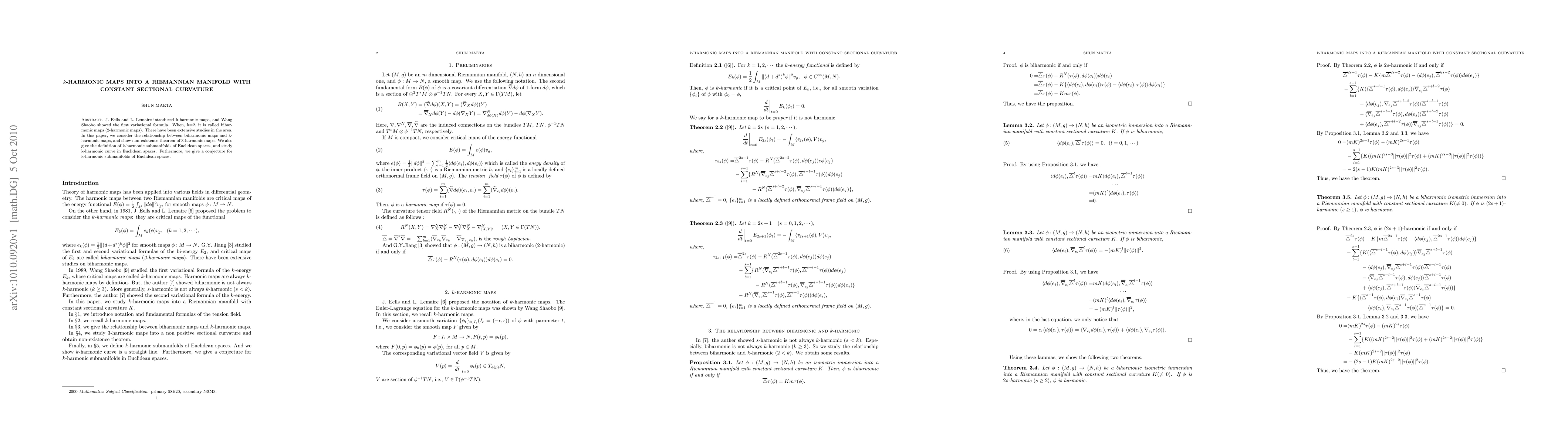 J. Eells and L. Lemaire introduced k-harmonic maps, and Wang Shaobo showed the first variational formula. When, k=2, it is called biharmonic maps (2-harmonic maps). There have been extensive studies in the area. In this paper, we consider the relationship between biharmonic maps and k-harmonic maps, and show non-existence theorem of 3-harmonic maps. We also give the definition of k-harmonic submanifolds of Euclidean spaces, and study k-harmonic curve in Euclidean spaces. Futhermore, we give a conjecture for k-harmonic submanifolds of Euclidean spaces.
