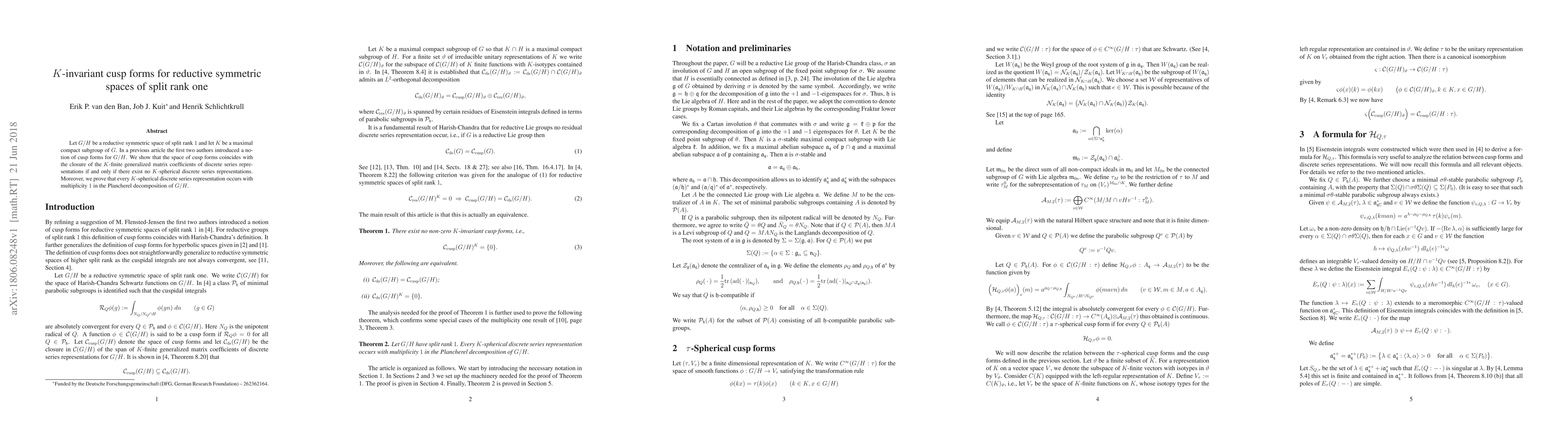 This paper explores cusp forms for reductive symmetric spaces of split rank one, demonstrating that the space of cusp forms matches the closure of $K$-finite generalized matrix coefficients from discrete series representations when no $K$-spherical discrete series exist. It also proves that each $K$-spherical discrete series representation appears with multiplicity one in the Plancherel decomposition of $G/H$.