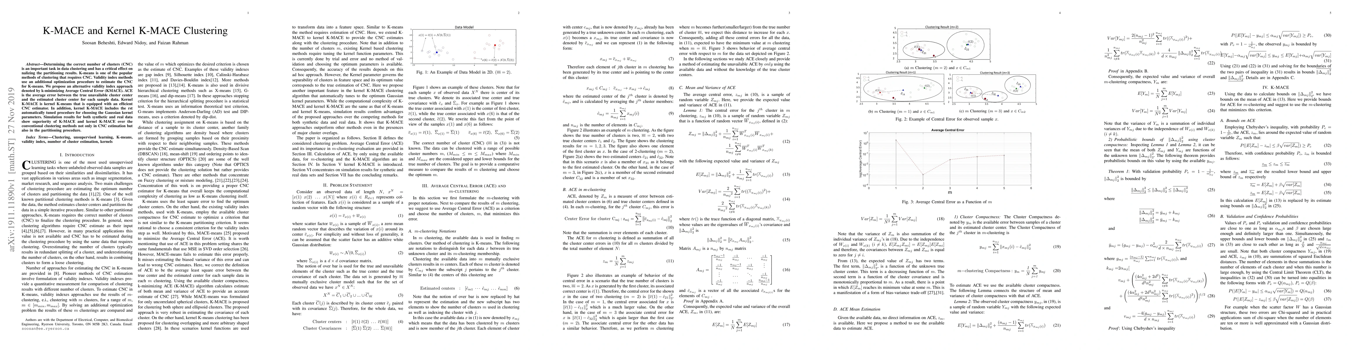 Determining the correct number of clusters (CNC) is an important task in data clustering and has a critical effect on finalizing the partitioning results. K-means is one of the popular methods of clustering that requires CNC. Validity index methods use an additional optimization procedure to estimate the CNC for K-means. We propose an alternative validity index approach denoted by k-minimizing Average Central Error (KMACE). K-means is one of the popular methods of clustering that requires CNC. Validity ACE is the average error between the true unavailable cluster center and the estimated cluster center for each sample data. Kernel K-MACE is kernel K-means that is equipped with an efficient CNC estimator. In addition, kernel K_MACE includes the first automatically tuned procedure for choosing the Gaussian kernel parameters. Simulation results for both synthetic and read data show superiority of K_MACE and kernel K-MACE over the conventional clustering methods not only in CNC estimation but also in the partitioning procedure.