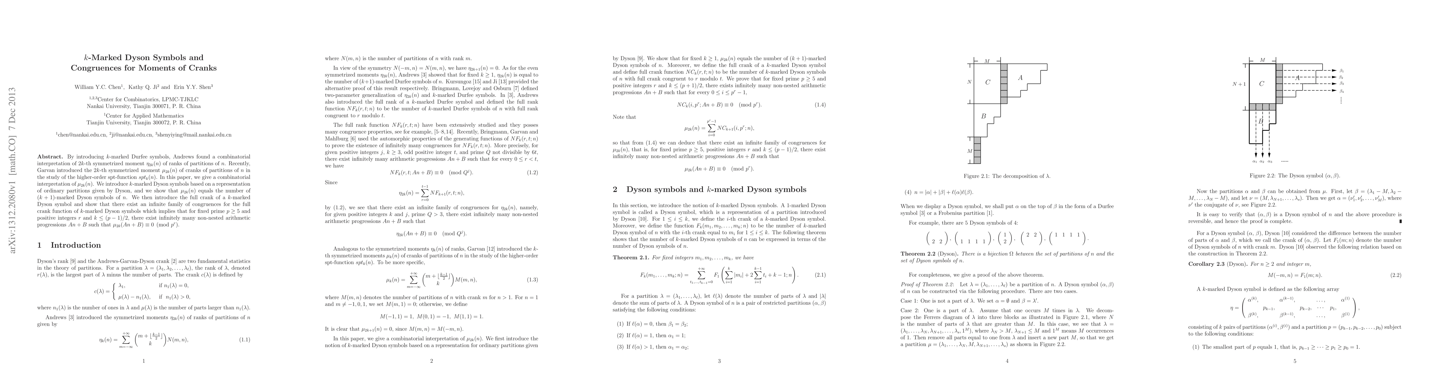By introducing $k$-marked Durfee symbols, Andrews found a combinatorial interpretation of $2k$-th symmetrized moment $\eta_{2k}(n)$ of ranks of partitions of $n$. Recently, Garvan introduced the $2k$-th symmetrized moment $\mu_{2k}(n)$ of cranks of partitions of $n$ in the study of the higher-order spt-function $spt_k(n)$. In this paper, we give a combinatorial interpretation of $\mu_{2k}(n)$. We introduce $k$-marked Dyson symbols based on a representation of ordinary partitions given by Dyson, and we show that $\mu_{2k}(n)$ equals the number of $(k+1)$-marked Dyson symbols of $n$. We then introduce the full crank of a $k$-marked Dyson symbol and show that there exist an infinite family of congruences for the full crank function of $k$-marked Dyson symbols which implies that for fixed prime $p\geq 5$ and positive integers $r$ and $k\leq (p-1)/2$, there exist infinitely many non-nested arithmetic progressions $An+B$ such that $\mu_{2k}(An+B)\equiv 0\pmod{p^r}$.