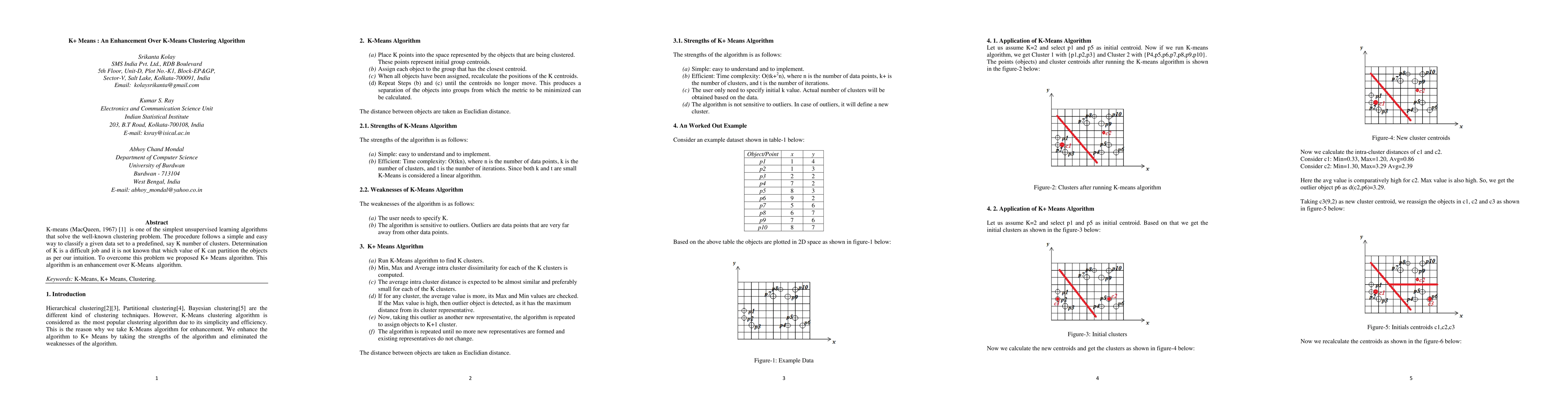 This paper proposes the K+ Means algorithm as an enhancement over the K-Means clustering method, addressing the challenge of determining the optimal number of clusters K. It aims to improve the clustering process by providing a more intuitive approach to K selection.