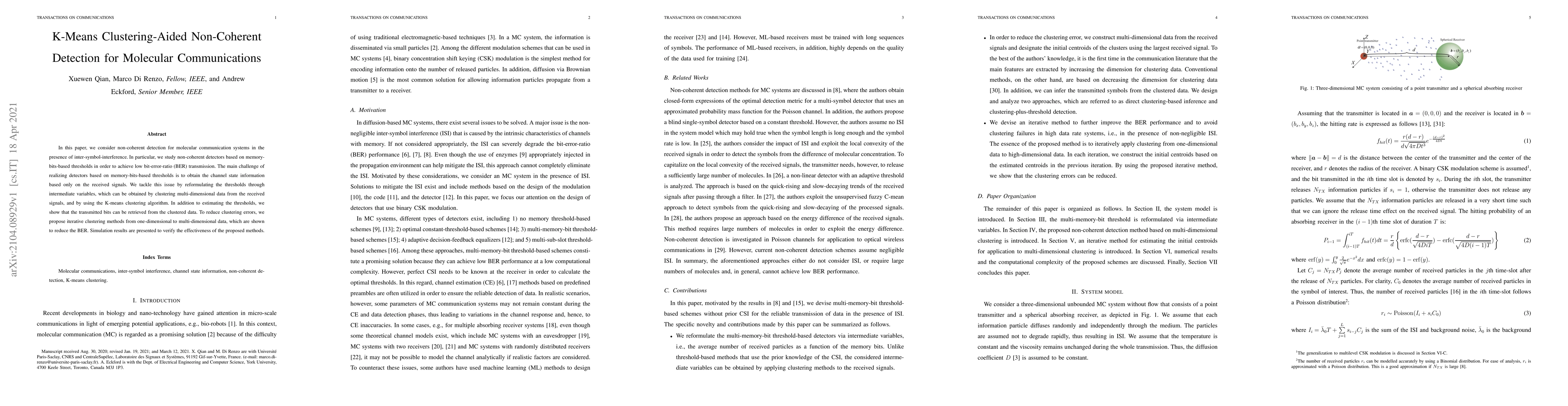 This paper proposes a non-coherent detection method for molecular communication systems using K-means clustering to estimate memory-bits-based thresholds, thereby reducing bit-error-ratio and improving transmission accuracy through iterative one-dimensional to multi-dimensional data clustering.
