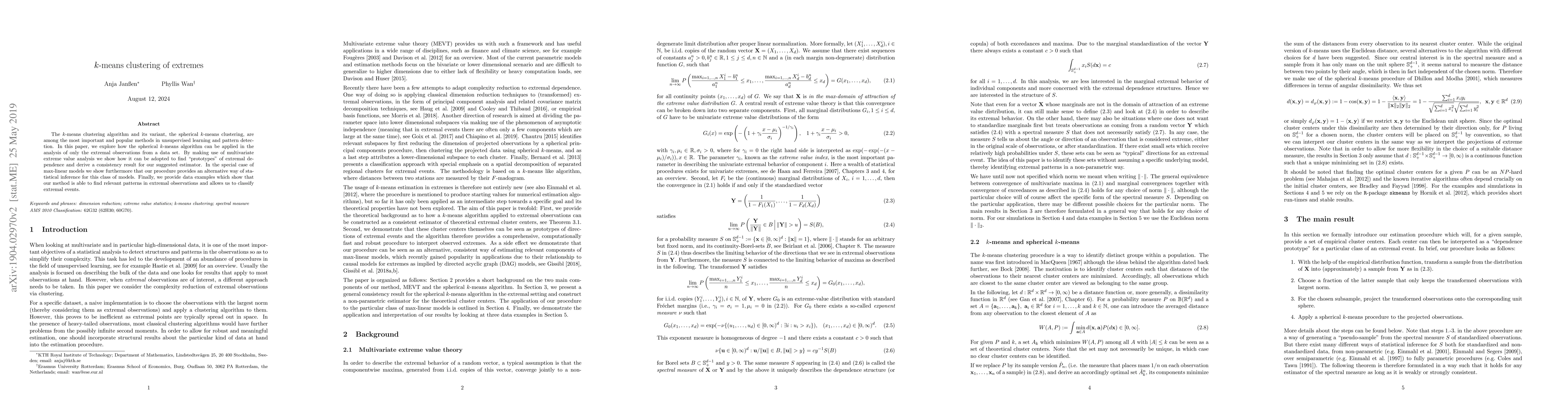 This paper investigates applying the spherical $k$-means clustering algorithm to analyze extremal observations in datasets, utilizing multivariate extreme value analysis to identify "prototypes" of extremal dependence. It demonstrates the method's consistency and provides an alternative statistical inference approach for max-linear models, supported by data examples showcasing its effectiveness in pattern detection and classification of extreme events.