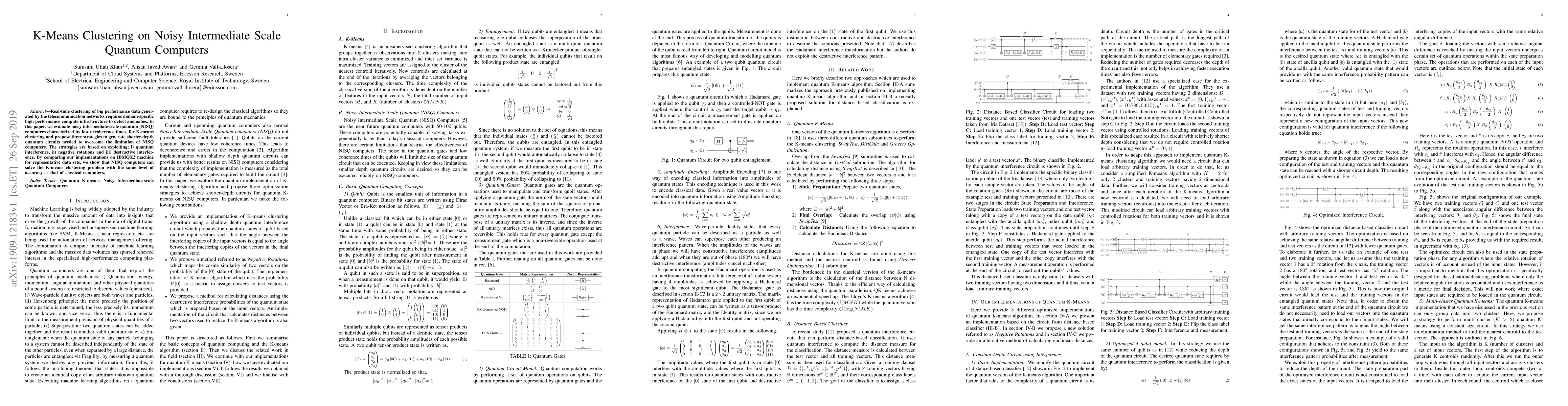 Real-time clustering of big performance data generated by the telecommunication networks requires domain-specific high performance compute infrastructure to detect anomalies. In this paper, we evaluate noisy intermediate-scale quantum (NISQ) computers characterized by low decoherence times, for K-means clustering and propose three strategies to generate shorter-depth quantum circuits needed to overcome the limitation of NISQ computers. The strategies are based on exploiting; i) quantum interference, ii) negative rotations and iii) destructive interference. By comparing our implementations on IBMQX2 machine for representative data sets, we show that NISQ computers can solve the K-means clustering problem with the same level of accuracy as that of classical computers.