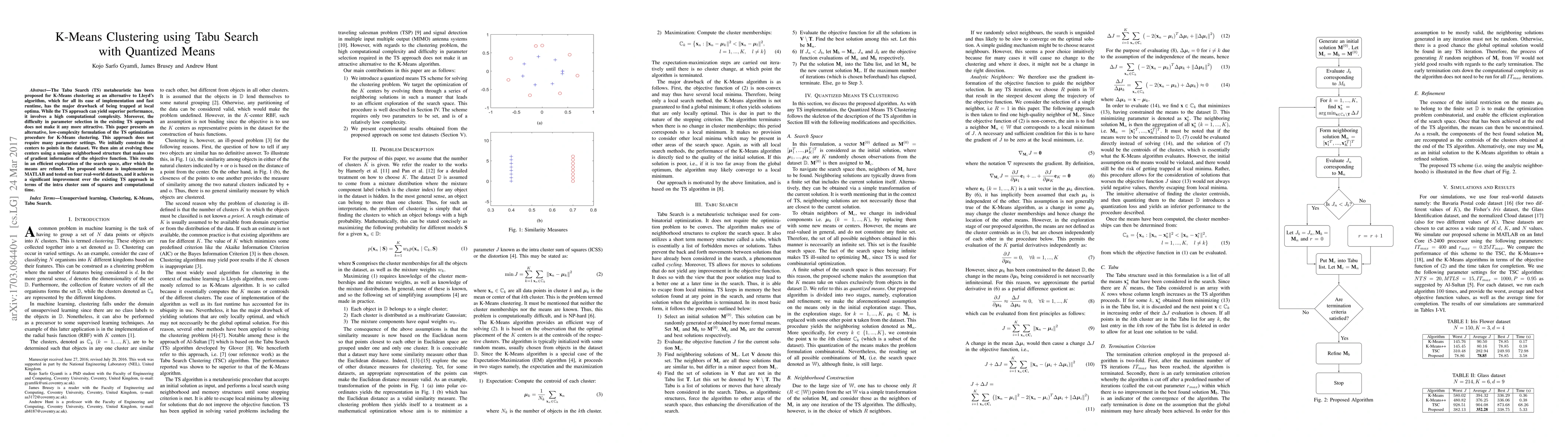 This paper proposes a low-complexity Tabu Search (TS) method for K-Means clustering that avoids local optima and simplifies parameter selection. The approach quantizes cluster means to dataset points and uses a unique neighborhood structure to efficiently explore the search space, achieving better results than the existing TS method on real-world datasets.