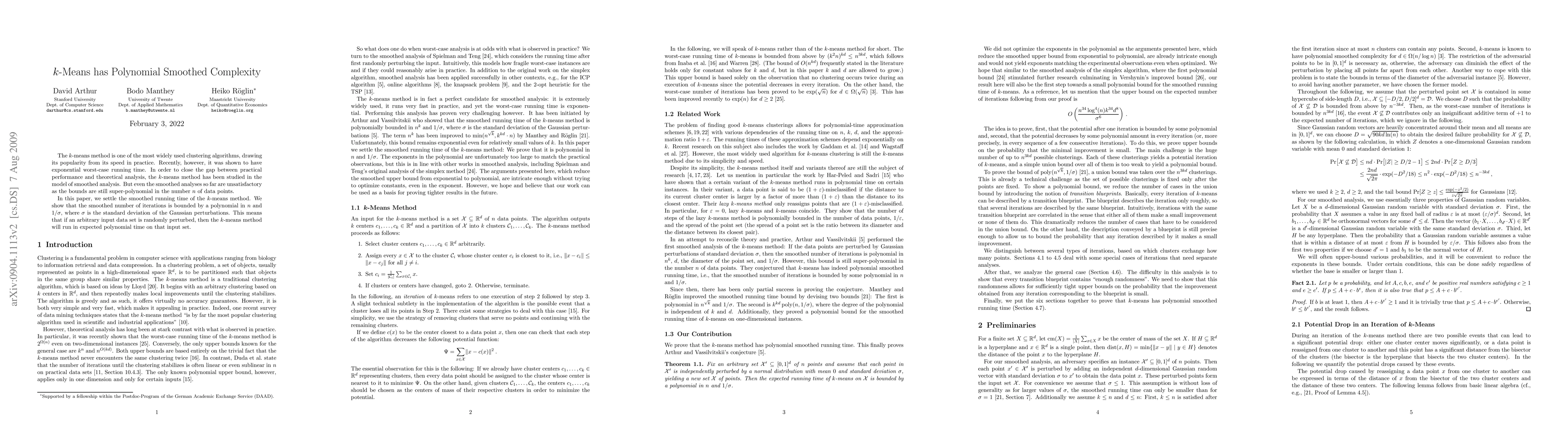 The k-means clustering algorithm has polynomial smoothed complexity, meaning its running time improves to polynomial order even when input data is randomly perturbed.