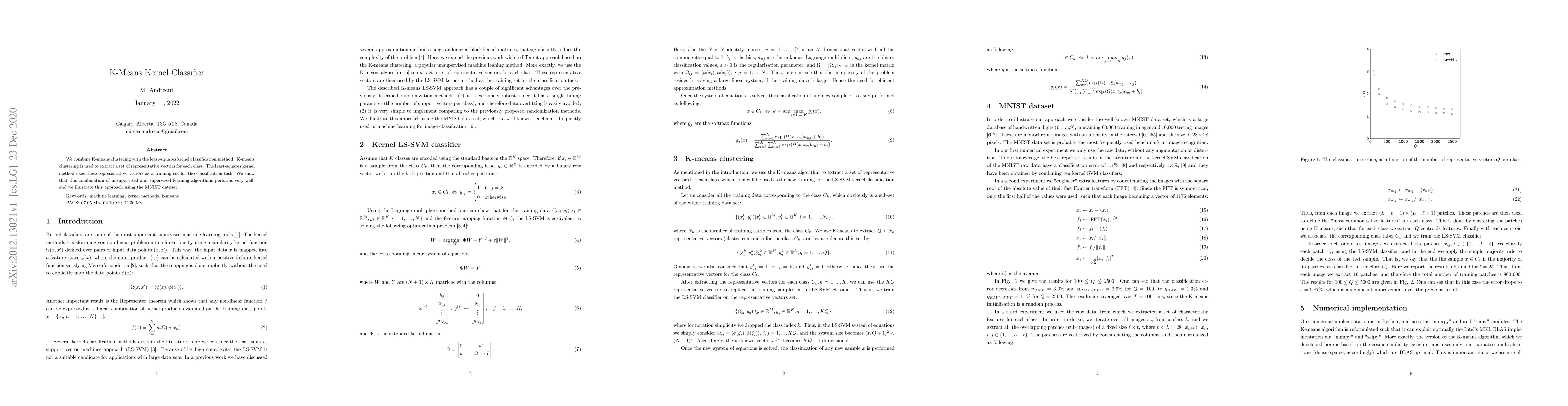 This paper combines K-means clustering with least-squares kernel classification to enhance classification performance. The K-means algorithm extracts representative vectors for each class, which are then used to train the kernel classifier, demonstrating superior results on the MNIST dataset.
