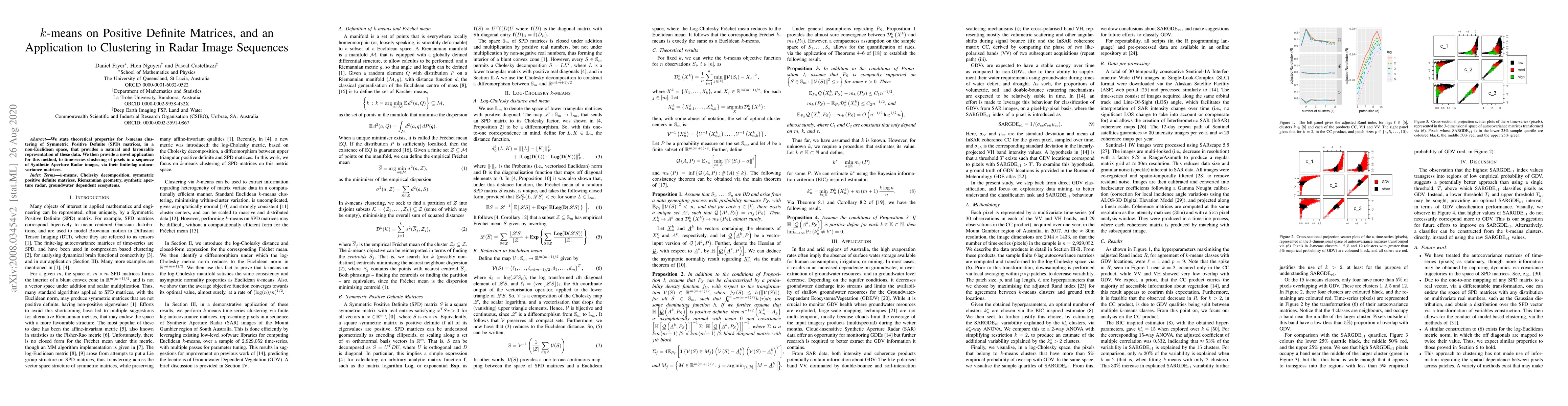 We state theoretical properties for $k$-means clustering of Symmetric Positive Definite (SPD) matrices, in a non-Euclidean space, that provides a natural and favourable representation of these data. We then provide a novel application for this method, to time-series clustering of pixels in a sequence of Synthetic Aperture Radar images, via their finite-lag autocovariance matrices.