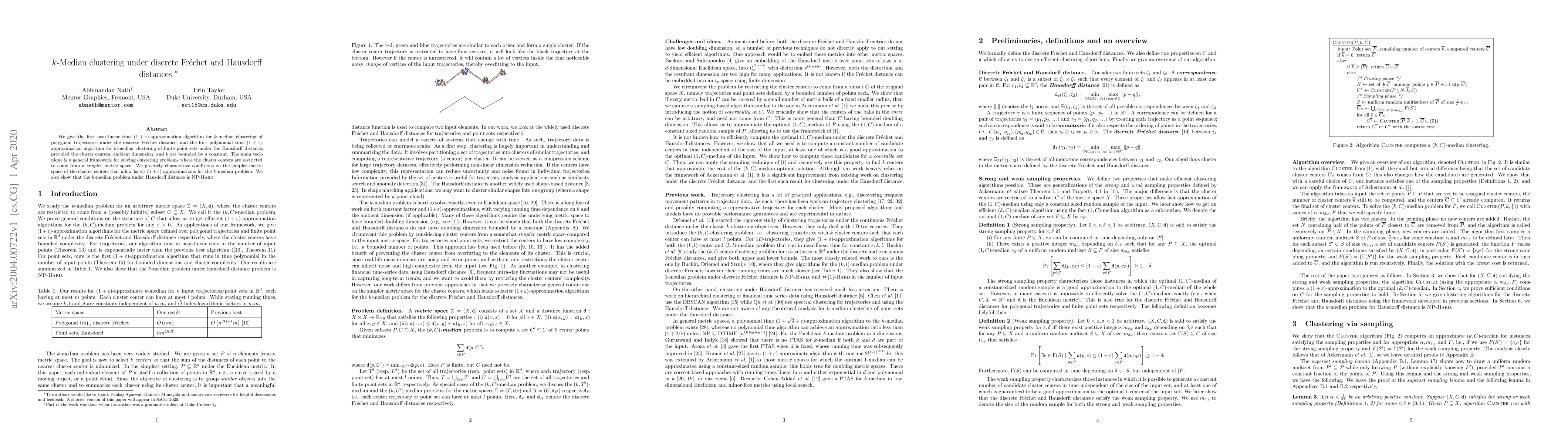 We give the first near-linear time $(1+\eps)$-approximation algorithm for $k$-median clustering of polygonal trajectories under the discrete Fr\'{e}chet distance, and the first polynomial time $(1+\eps)$-approximation algorithm for $k$-median clustering of finite point sets under the Hausdorff distance, provided the cluster centers, ambient dimension, and $k$ are bounded by a constant. The main technique is a general framework for solving clustering problems where the cluster centers are restricted to come from a \emph{simpler} metric space. We precisely characterize conditions on the simpler metric space of the cluster centers that allow faster $(1+\eps)$-approximations for the $k$-median problem. We also show that the $k$-median problem under Hausdorff distance is \textsc{NP-Hard}.