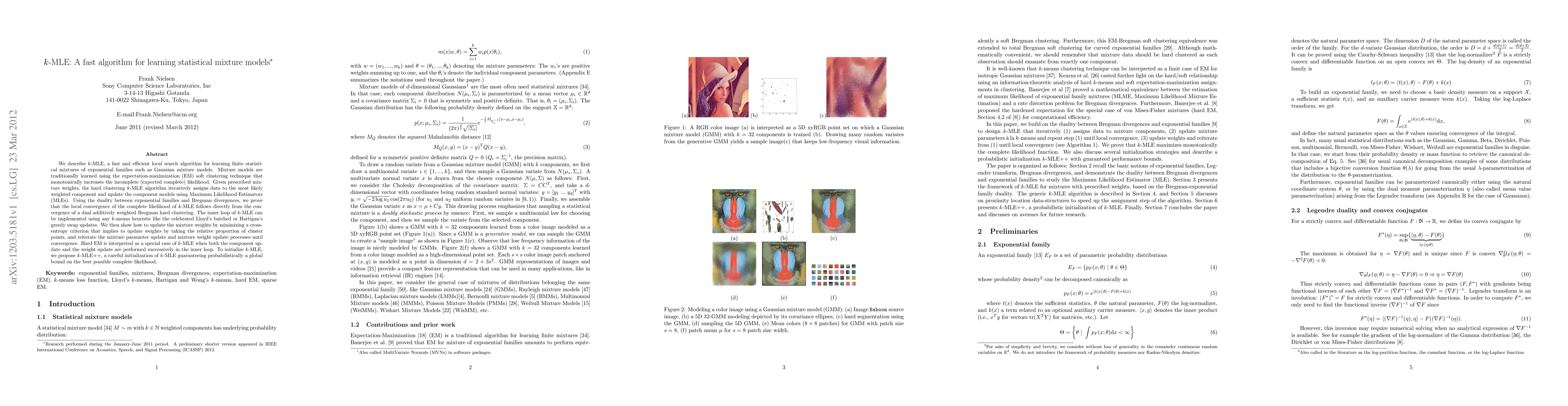 $k$-MLE is a fast local search algorithm for learning finite statistical mixtures of exponential families, offering an efficient alternative to traditional EM. It iteratively assigns data to the most likely weighted component and updates models using MLEs, leveraging the duality between exponential families and Bregman divergences for convergence guarantees.