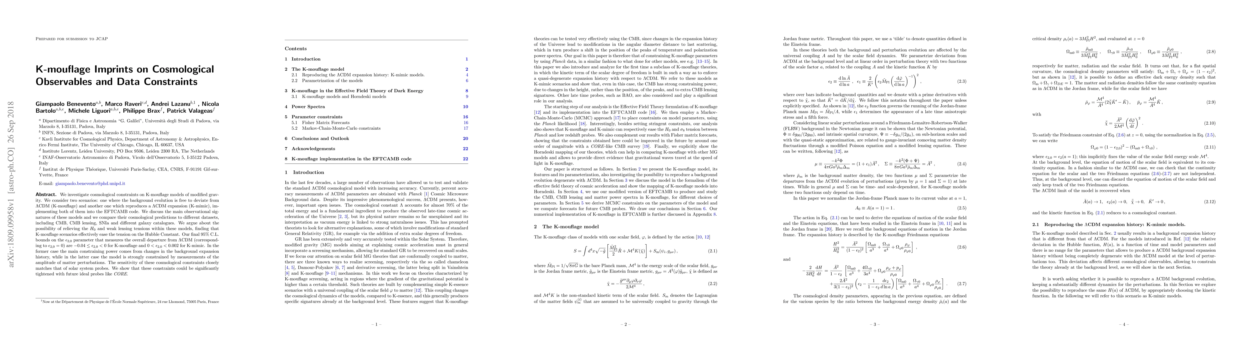 We investigate cosmological constraints on K-mouflage models of modified gravity. We consider two scenarios: one where the background evolution is free to deviate from $\Lambda$CDM (K-mouflage) and another one which reproduces a $\Lambda$CDM expansion (K-mimic), implementing both of them into the EFTCAMB code. We discuss the main observational signatures of these models and we compare their cosmological predictions to different datasets, including CMB, CMB lensing, SNIa and different galaxy catalogues. We argue about the possibility of relieving the $H_0$ and weak lensing tensions within these models, finding that K-mouflage scenarios effectively ease the tension on the Hubble Constant. Our final 95\% C.L. bounds on the $\epsilon_{2,0}$ parameter that measures the overall departure from $\Lambda$CDM (corresponding to $\epsilon_{2,0}=0$) are $-0.04\leq \epsilon_{2,0} <0$ for K-mouflage and $0< \epsilon_{2,0} <0.002$ for K-mimic. In the former case the main constraining power comes from changes in the background expansion history, while in the latter case the model is strongly constrained by measurements of the amplitude of matter perturbations. The sensitivity of these cosmological constraints closely matches that of solar system probes. We show that these constraints could be significantly tightened with future ideal probes like CORE.