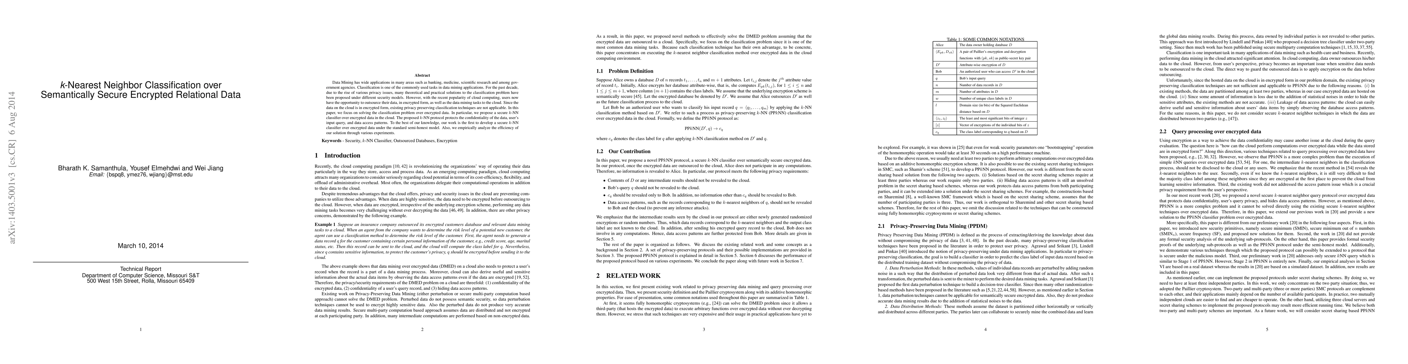 This paper presents a novel k-Nearest Neighbor (k-NN) classification method for encrypted relational data in the cloud, ensuring confidentiality of data, user queries, and access patterns under a semi-honest security model. The proposed method is the first of its kind and is empirically analyzed for efficiency.