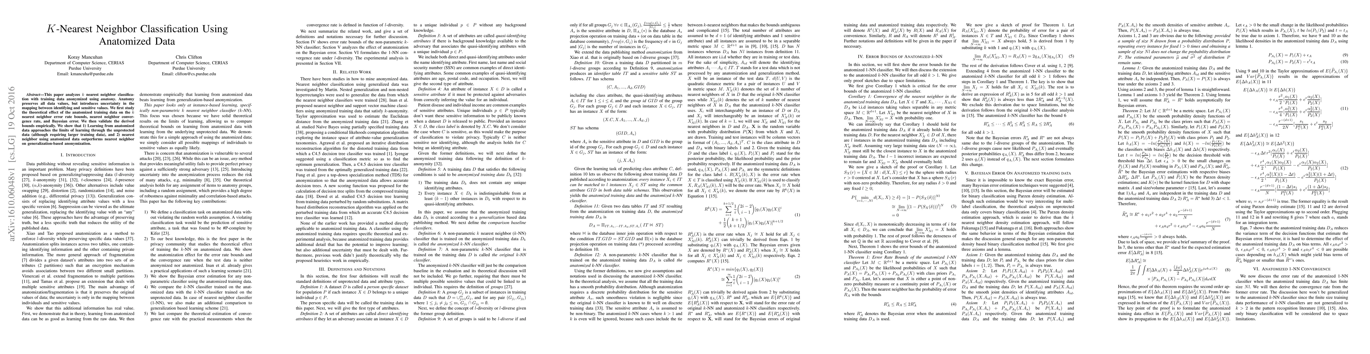 This paper analyzes k nearest neighbor classification with training data anonymized using anatomy. Anatomy preserves all data values, but introduces uncertainty in the mapping between identifying and sensitive values. We first study the theoretical effect of the anatomized training data on the k nearest neighbor error rate bounds, nearest neighbor convergence rate, and Bayesian error. We then validate the derived bounds empirically. We show that 1) Learning from anatomized data approaches the limits of learning through the unprotected data (although requiring larger training data), and 2) nearest neighbor using anatomized data outperforms nearest neighbor on generalization-based anonymization.