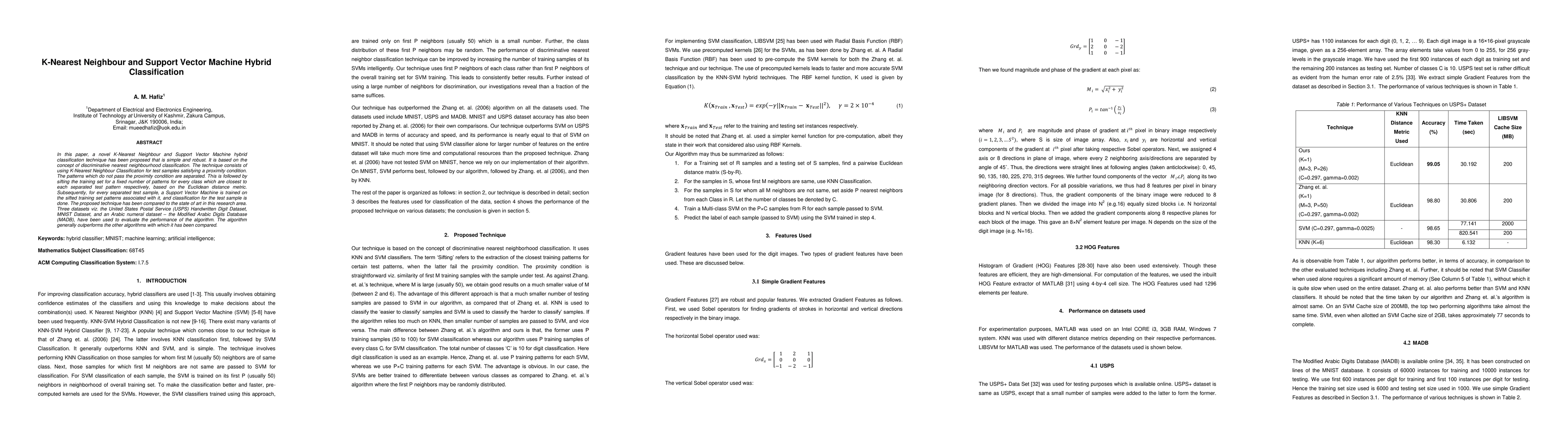 This paper proposes a hybrid K-Nearest Neighbour and Support Vector Machine classification technique that leverages discriminative nearest neighbourhood classification. It outperforms other methods on USPS, MNIST, and MADB datasets, showing better performance in classification tasks.