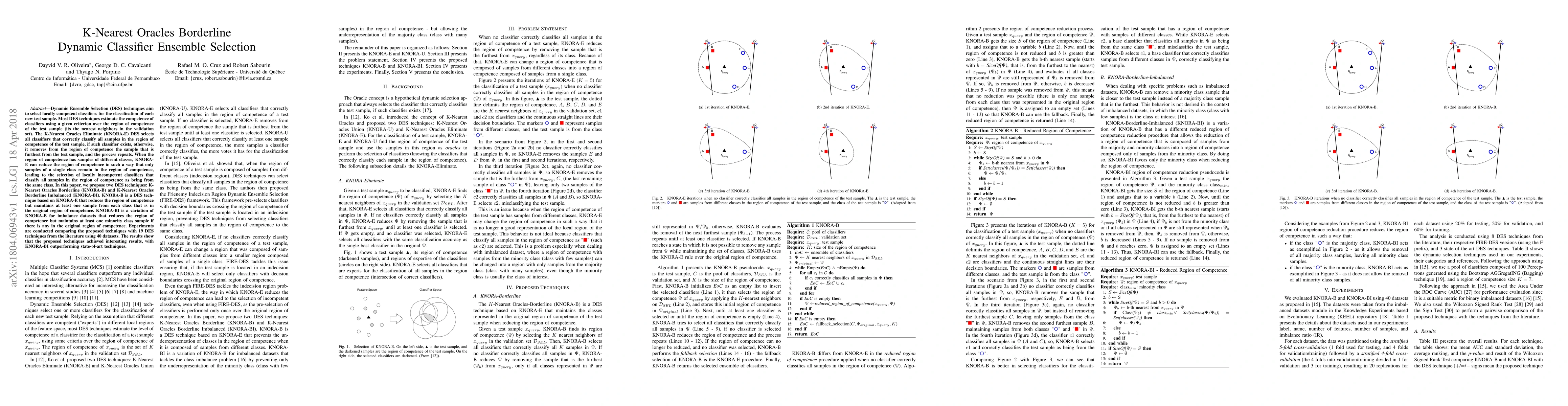 Dynamic Ensemble Selection (DES) techniques aim to select locally competent classifiers for the classification of each new test sample. Most DES techniques estimate the competence of classifiers using a given criterion over the region of competence of the test sample (its the nearest neighbors in the validation set). The K-Nearest Oracles Eliminate (KNORA-E) DES selects all classifiers that correctly classify all samples in the region of competence of the test sample, if such classifier exists, otherwise, it removes from the region of competence the sample that is furthest from the test sample, and the process repeats. When the region of competence has samples of different classes, KNORA-E can reduce the region of competence in such a way that only samples of a single class remain in the region of competence, leading to the selection of locally incompetent classifiers that classify all samples in the region of competence as being from the same class. In this paper, we propose two DES techniques: K-Nearest Oracles Borderline (KNORA-B) and K-Nearest Oracles Borderline Imbalanced (KNORA-BI). KNORA-B is a DES technique based on KNORA-E that reduces the region of competence but maintains at least one sample from each class that is in the original region of competence. KNORA-BI is a variation of KNORA-B for imbalance datasets that reduces the region of competence but maintains at least one minority class sample if there is any in the original region of competence. Experiments are conducted comparing the proposed techniques with 19 DES techniques from the literature using 40 datasets. The results show that the proposed techniques achieved interesting results, with KNORA-BI outperforming state-of-art techniques.