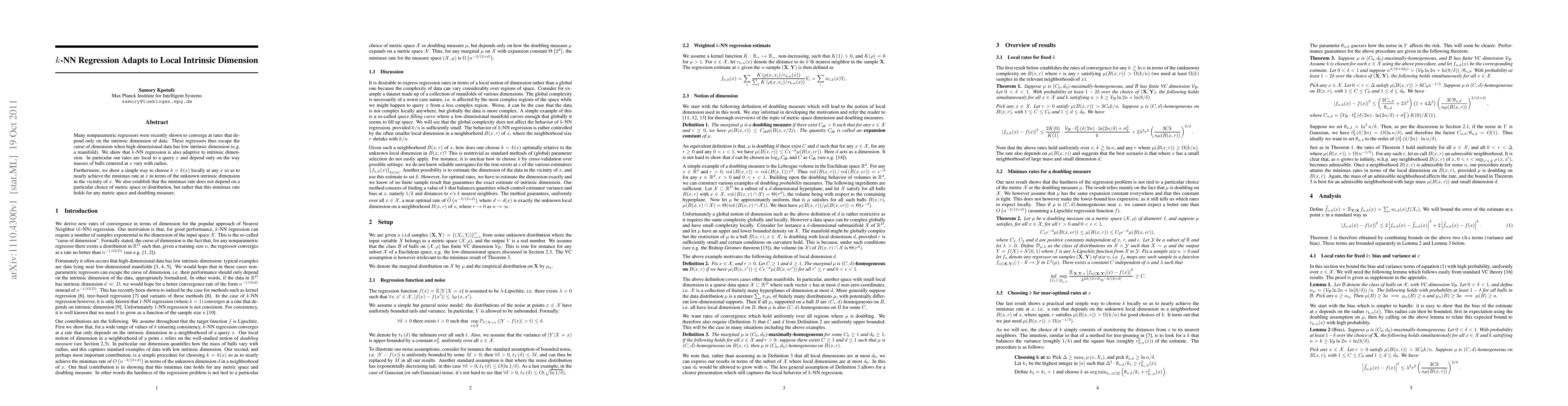 This paper demonstrates that k-NN regression can adapt to the local intrinsic dimension of data, achieving convergence rates that depend only on the intrinsic dimension near a query point. It proposes a method to select the optimal k value locally to nearly achieve the minimax rate, independent of the metric space or distribution.