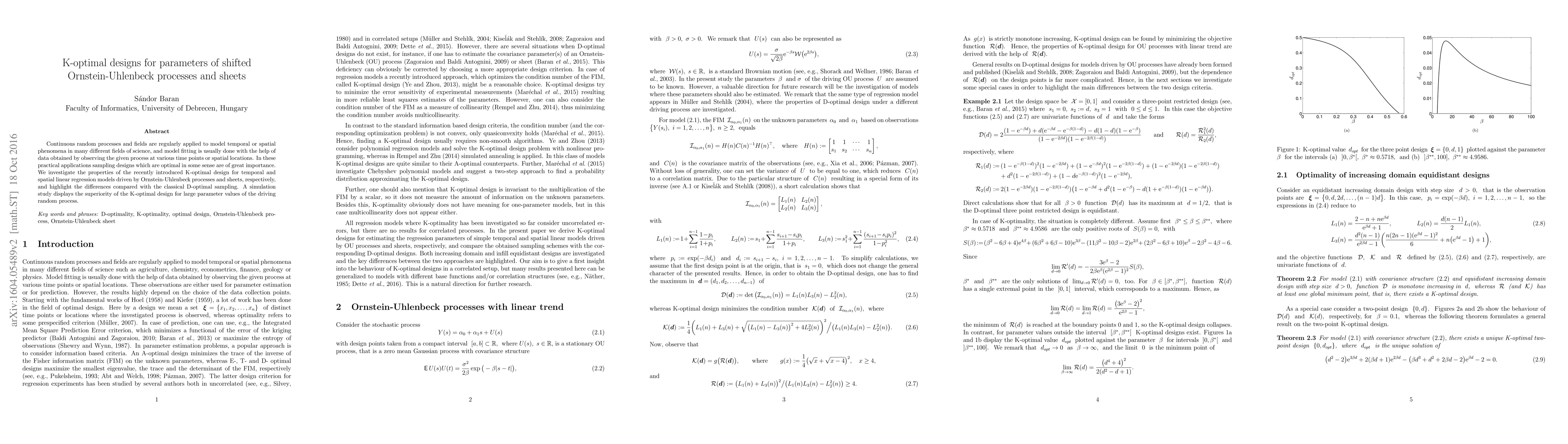 Continuous random processes and fields are regularly applied to model temporal or spatial phenomena in many different fields of science, and model fitting is usually done with the help of data obtained by observing the given process at various time points or spatial locations. In these practical applications sampling designs which are optimal in some sense are of great importance. We investigate the properties of the recently introduced K-optimal design for temporal and spatial linear regression models driven by Ornstein-Uhlenbeck processes and sheets, respectively, and highlight the differences compared with the classical D-optimal sampling. A simulation study displays the superiority of the K-optimal design for large parameter values of the driving random process.