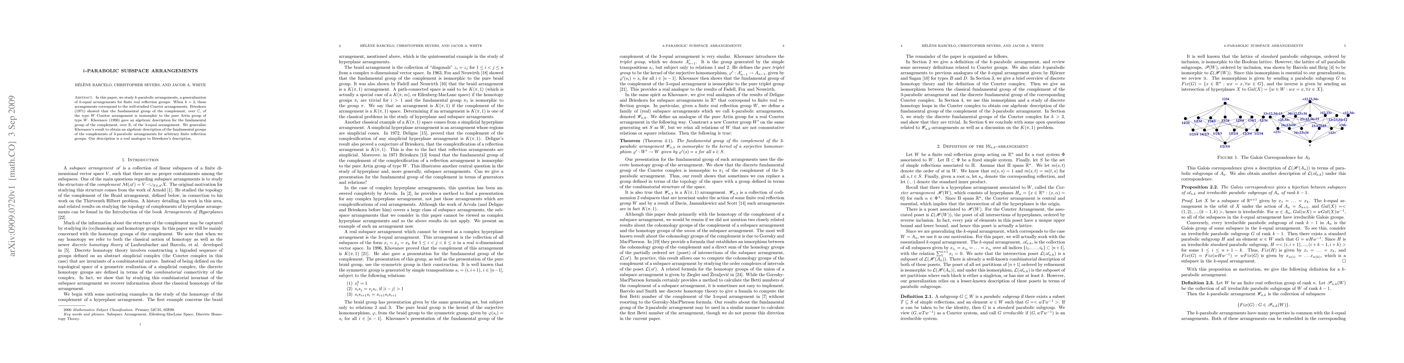 This paper generalizes $k$-equal arrangements for finite real reflection groups, focusing on $k$-parabolic subspace arrangements, particularly when $k=2$ corresponding to Coxeter arrangements. It provides an algebraic description of the fundamental groups of complements of 3-parabolic arrangements, extending Khovanov's work and mirroring Brieskorn's result for Coxeter arrangements.