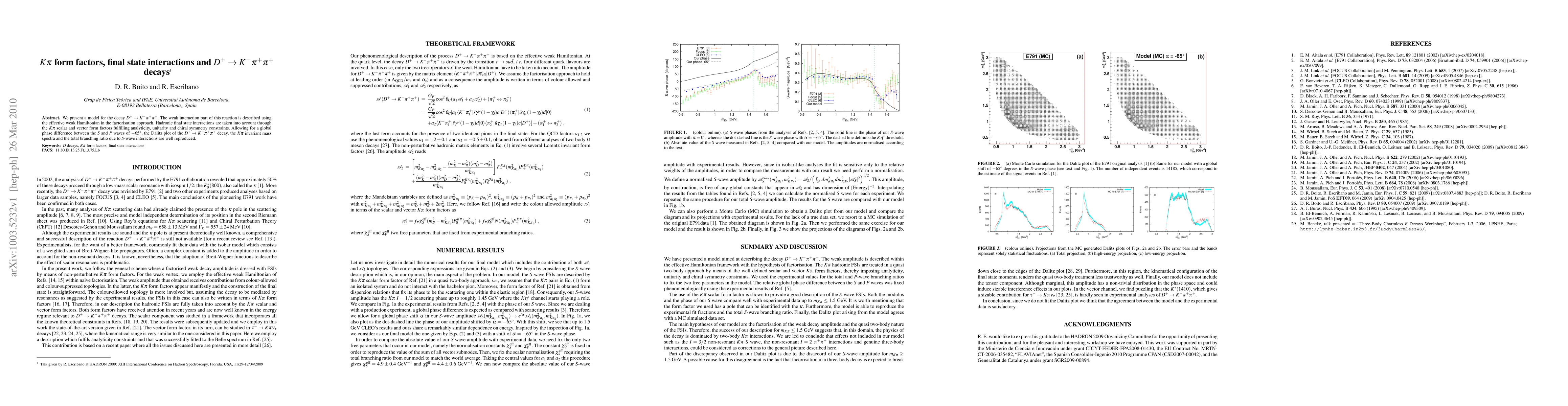 This paper models the decay $D^+\to K^-\pi^+\pi^+$ using an effective weak Hamiltonian and considers hadronic final state interactions via $K\pi$ form factors. The model accurately reproduces the Dalitz plot, $K\pi$ invariant mass spectra, and total branching ratio, allowing for a $-65^\circ$ phase difference between $S$ and $P$ waves.